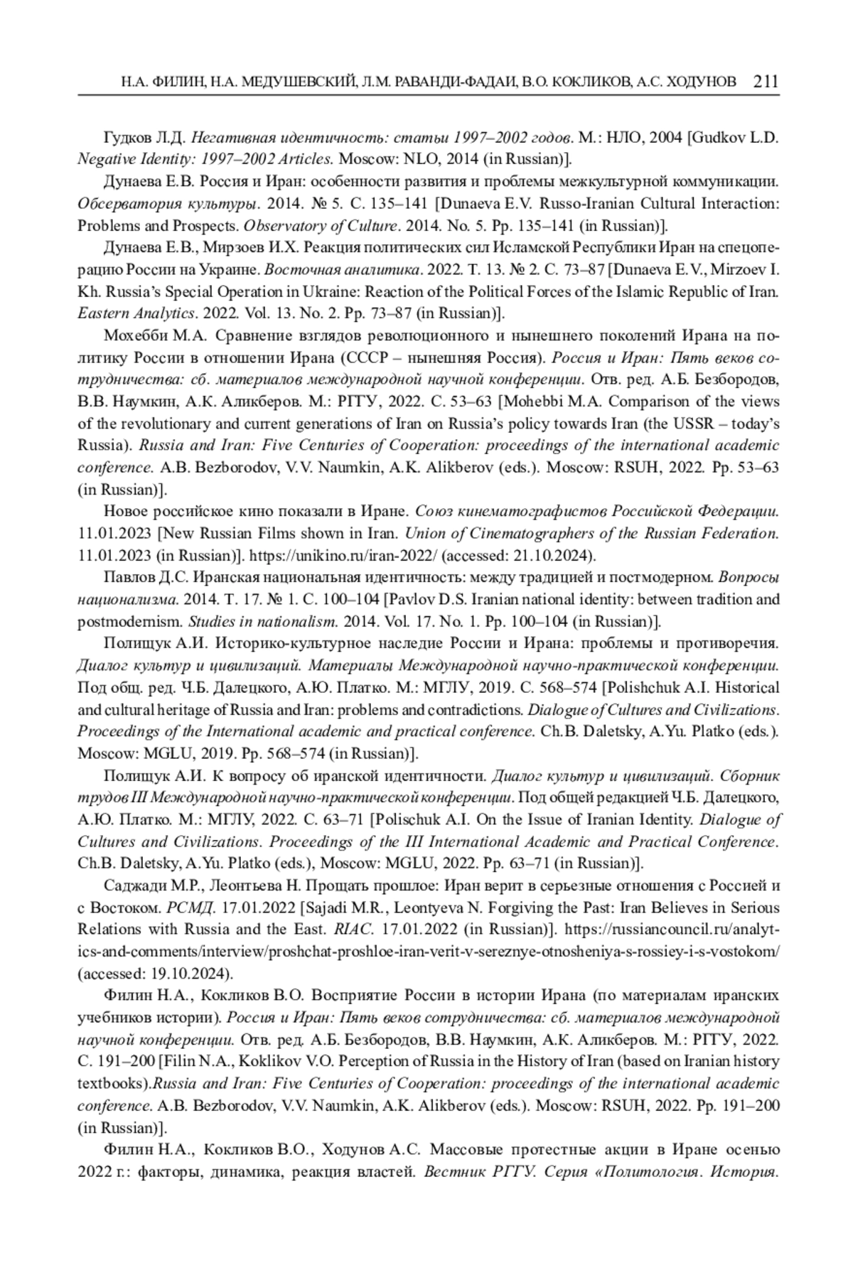 15. Филин Н. А., Кокликов В. О. Восприятие России в истории Ирана (по материалам иранских учебников истории). Россия и Иран: Пять веков сотрудничества: сб. материалов международной научной конференциu. Отв. ред. А. Б. Безбородов, В. В. Наумкин, А. К. Аликберов. М.: РГГУ, 2022. С. 191-200.