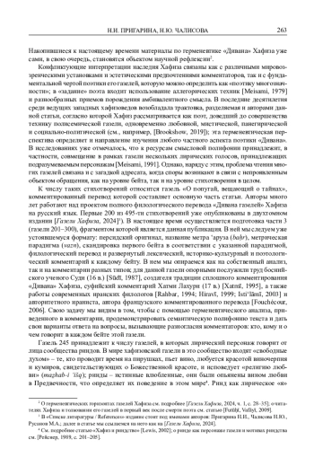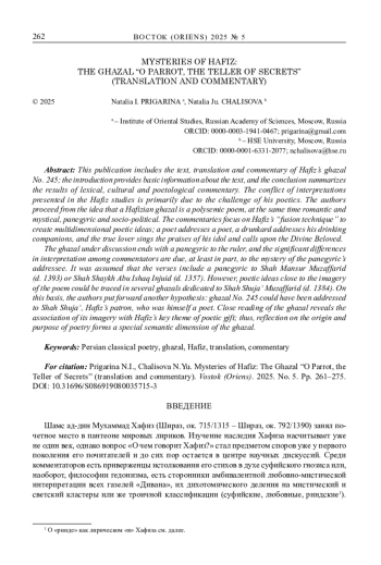 3. Пригарина Н.И., Чалисова Н.Ю., Русанов М.А. Газели Хафиза. Тексты, переводы, комментарии. Ч. 1, 2. Серия Orientalia et Classica, VI (LXXVII). М.: Издательский дом Высшей школы экономики, 2024. EDN: DBPMFV
