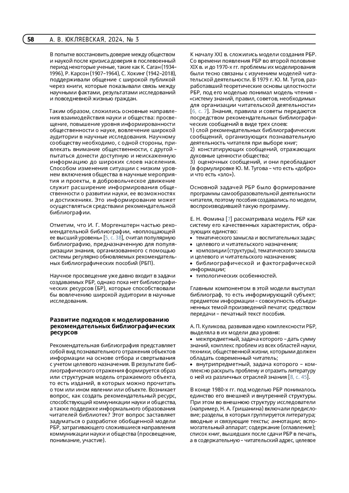 8. Куликова А. П. Комплексное пособие как средство организации разностороннего чтения молодежи в помощь ее социальной ориентации // Рекомендательное библиографическое пособие: проблемы его целостности. Москва, 1979. С. 37-53.