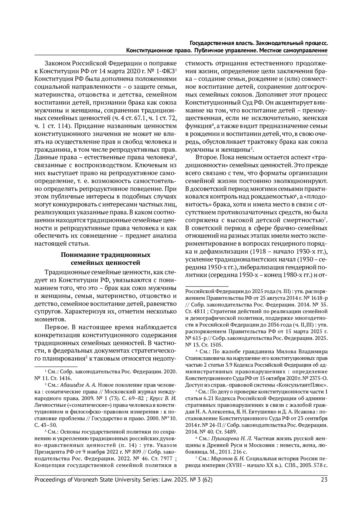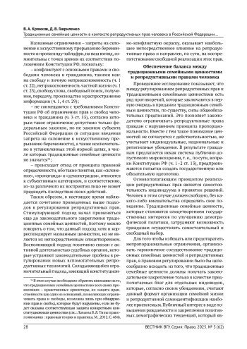 В статье анализируется соотношение традиционных семейных ценностей и репродуктивных прав. Фокус внимания исследователей сосредоточен на поиске баланса между указанными категориями и формулировании предложений по его достижению. В ходе исследования были рассмотрены вопросы правового закрепления традиционных семейных ценностей и репродуктивных прав, а также выявлены современные подходы по регулированию названных прав с учетом традиционных семейных ценностей. Авторы констатируют, что между традиционными семейными ценностями и репродуктивными правами существует ряд противоречий, которые приводят к непропорциональному ограничению последних. Данная ситуация может быть нивелирована путем предоставления полноценной возможности по реализации права каждого на репродуктивное самоопределение.