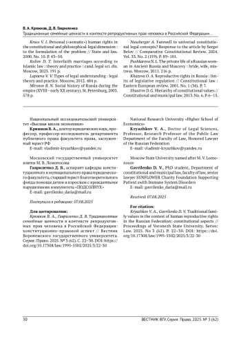 11. Хазова O. A. Репродуктивные права в России: пределы законодательного регулирования // Конституционное право: восточноевропейское обозрение. 2001. № 1 (34). С. 7.