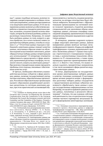 Национальный проект «Экономика данных», направленный на цифровую трансформацию различных сфер, является следующей ступенью для обеспечения научно-технологического суверенитета в Российской Федерации, при этом ключевым моментом для реализации многочисленных направлений, федеральных проектов, мероприятий в рамках национального проекта является повышение качества как данных, так и их наборов, обеспечение роста доступных для использования различными субъектами данных. Вопросы качества данных и особенно управления таким качеством остаются за рамками нормативного обеспечения и регулирования. Между тем одним из способов обеспечения качества данных является индустрия аннотации данных. Многие страны обращают внимание на потенциал, заложенный в развитии данного направления, начинают принимать стратегические документы. В статье обосновывается необходимость нормативного обеспечения развития индустрии аннотации данных в Российской Федерации, рассматриваются зарубежные подходы, которые в настоящее время начинают формироваться в данной сфере, предлагаются направления, которые следует развивать для системного становления индустрии аннотации в России как способа обеспечения качества данных. Обращается внимание на многогранность потенциала аннотации данных, в том числе для обеспечения качества алгоритмов, развития узко специализированных моделей искусственного интеллекта.