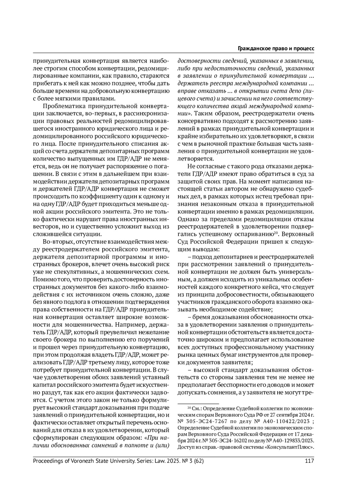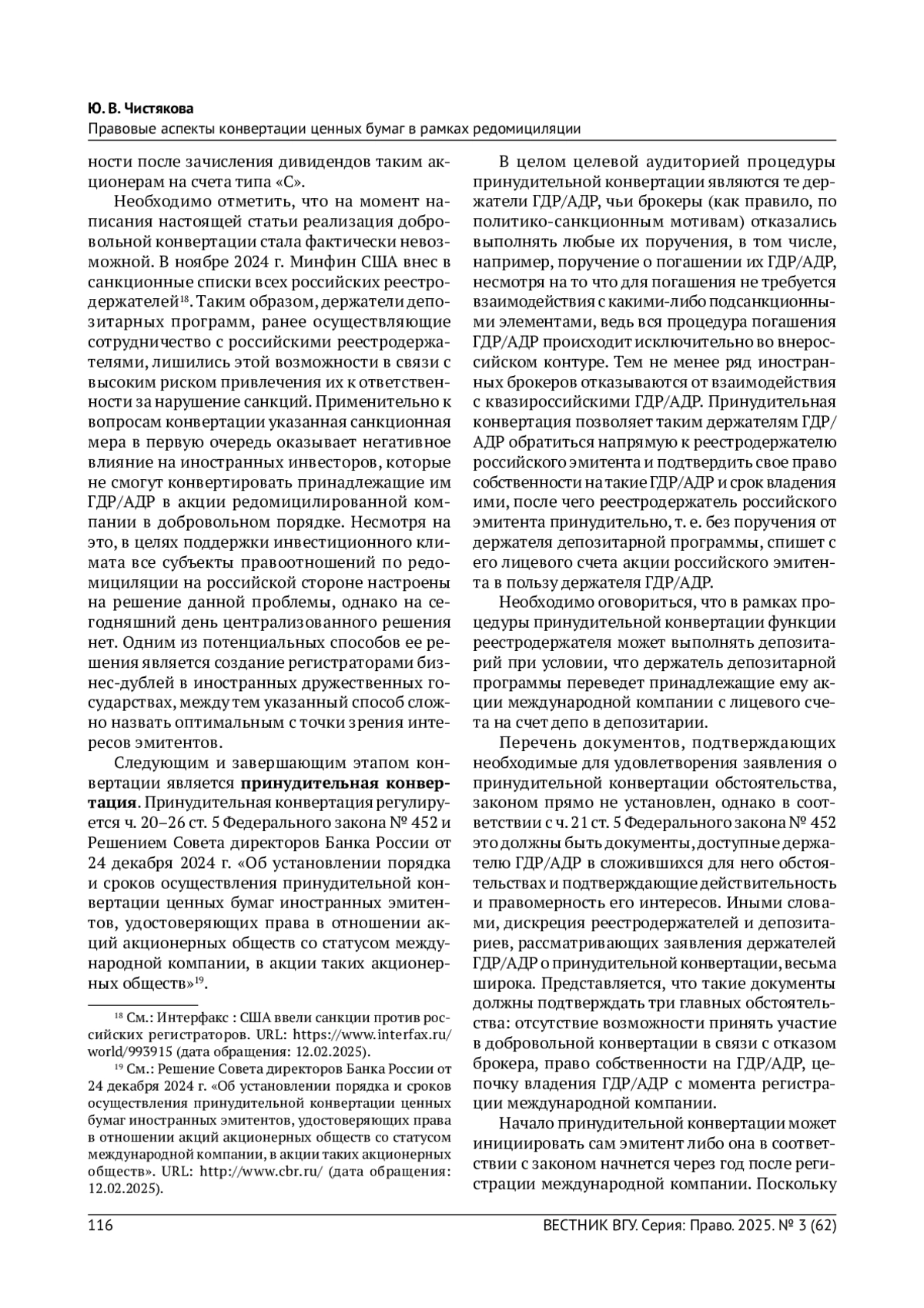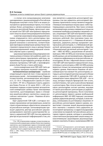 Аналитично описаны этапы конвертации ценных бумаг иностранного эмитента, удостоверяющих права в отношении акций международной компании. Рассмотрены правовые особенности и практические нюансы реализации этапов конвертации. Выявлены проблемы правового регулирования конвертации в рамках редомициляции, предложены варианты их разрешения, а также проанализирована релевантная судебная практика.