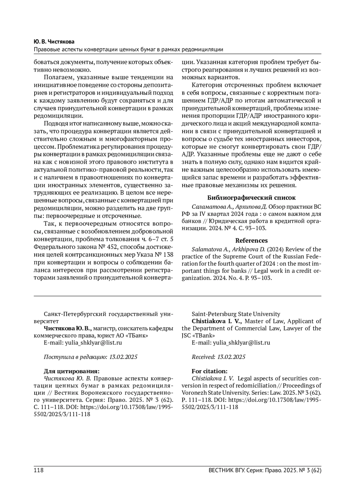 1. Саламатова А., Архипова Д. Обзор практики ВС РФ за IV квартал 2024 года: о самом важном для банков // Юридическая работа в кредитной организации. 2024. № 4. С. 93-103.