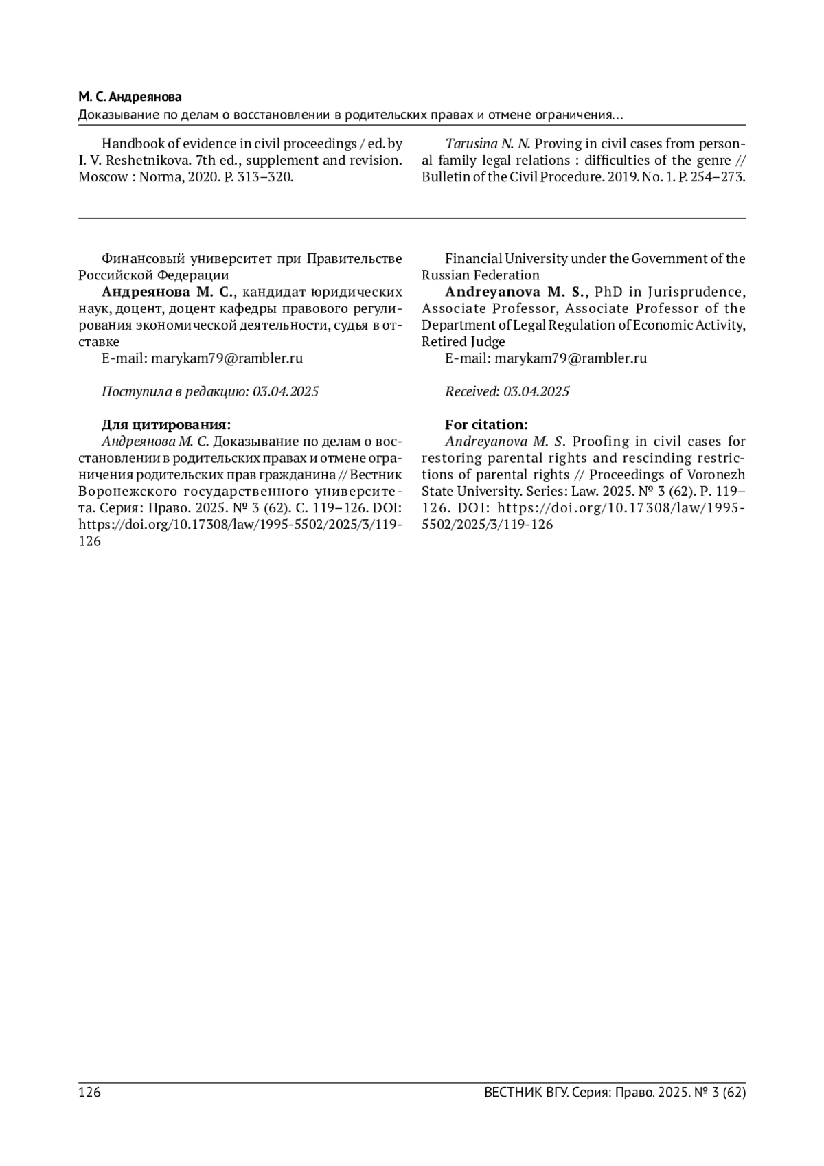 5. Тарусина Н. Н. Доказывание по гражданским делам из личных семейных правоотношений: трудности жанра // Вестник гражданского процесса. 2019. № 1. С. 254-273. EDN: YZYBBB