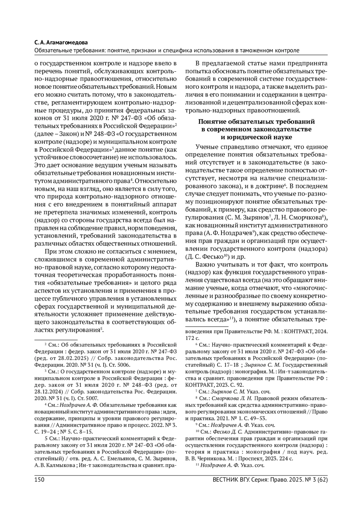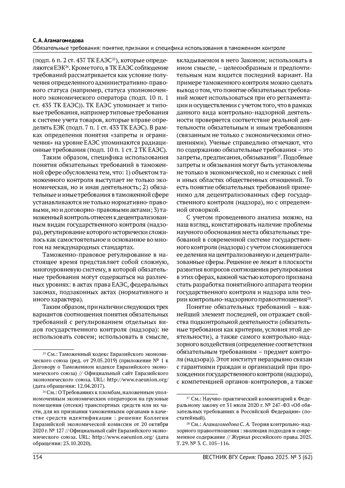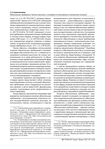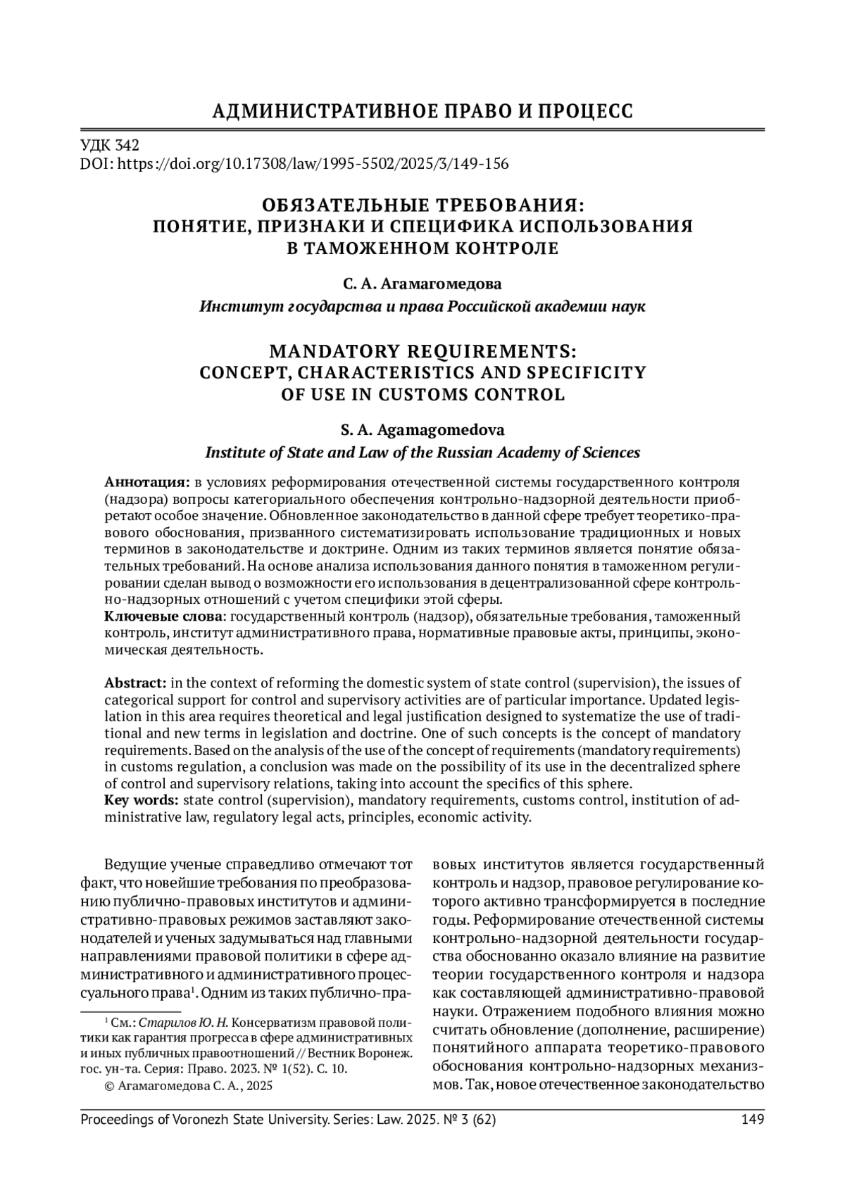АГАМАГОМЕДОВА С. А. ОБЯЗАТЕЛЬНЫЕ ТРЕБОВАНИЯ: ПОНЯТИЕ, ПРИЗНАКИ И СПЕЦИФИКА ИСПОЛЬЗОВАНИЯ В ТАМОЖЕННОМ КОНТРОЛЕ // ВЕСТНИК ВОРОНЕЖСКОГО ГОСУДАРСТВЕННОГО УНИВЕРСИТЕТА. СЕРИЯ: ПРАВО. 2025. № 3 (62) (33 СТ.)