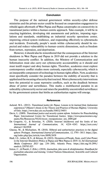 5. Hadi, I.S., Arfani, R.N., & Ikhwan, H. (2022). Dynamics of People, State, and Cyber Power in the Internet Shutdown Policy at Papua and West Papua in 2019. In 3rd International Media Conference 2021 (pp. 234-248). Atlantis Press. DOI: 10.2991/assehr.k.220705.025