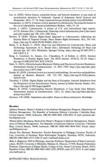 Отключение интернета в Западном Папуа и Новой Гвинее рассматривается как пример неспособности министерства связи и информатизации Республики Индонезия сбалансировать национальную безопасность и цифровые свободы. Отключение интернета подверглось критике как авторитарная стратегия, которая подрывает права человека и цифровые свободы, создавая и углубляя недоверие между государством и гражданами. Государству (в данном случае министерству) необходимо воздержаться от злоупотребления своими полномочиями и гарантировать, что правила кибербезопасности не нарушат гражданские свободы, поскольку чрезмерные ограничения ослабляют демократические ценности. Показывается несоблюдение государством (министерством) стандартов кибербезопасности, что привело к нарушениям прав человека и манипулированию восприятием национальной безопасности, а в конечном итоге нанесло ущерб репутации Индонезии. Подчеркивается ценность долгосрочных отношений в переходном правосудии, обосновывается необходимость подхода, ориентированного на человека, институциональной транс формации в рамках национальных инициатив по кибербезопасности, важность прозрачности, подотчетности и защиты в предотвращении будущих злоупотреблений. Авторы призывают к переоценке практик кибербезопасности для цифровых свобод, указывая на необходимость прозрачной и инклюзивной политики, отражающей демократические принципы.