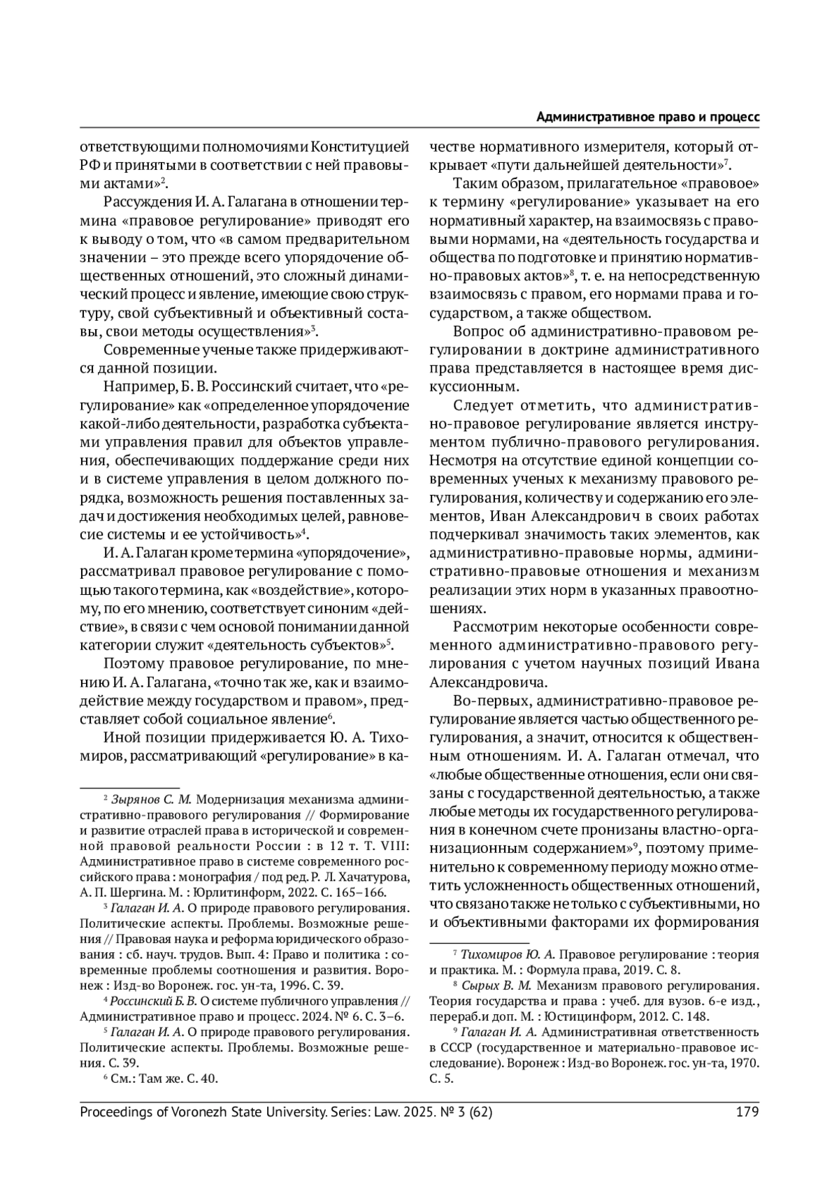 1. Братченко С. А. К вопросу о понятии качества государственного управления // Вестник Института экономики Российской академии наук. 2019. № 1. С. 57-72. EDN: YXTSNN 2. Галаган И. А. Административная ответственность в СССР (государственное и материально-правовое исследование). Воронеж: Изд-во Воронеж. гос. ун-та, 1970. 251 с. 3. Галаган И. А. О природе правового регулирования. Политические аспекты. Проблемы. Возможные решения // Правовая наука и реформа юридического образования: сб. науч. трудов. Вып. 4: Право и политика: современные проблемы соотношения и развития. Воронеж: Изд-во Воронеж. гос. ун-та, 1996. С. 21-43. 4. Гриценко В. В. Научные идеи Ивана Александровича Галагана об административной ответственности в контексте современных российских реформ // Вестник Воронеж. гос. ун-та. Серия Право.2022. № 4 (51). С. 230-242. 5. Емельянов А. С. Механизм административно-правового регулирования // Журнал российского права. 2024. Т. 8. № 8. С. 127-145. EDN: OXXCIK 6. Зырянов С. М. Модернизация механизма административно-правового регулирования // Формирование и развитие отраслей права в исторической и современной правовой реальности России: в 12 т. Т. VIII: Административное право в системе современного российского права: монография / под ред. Р. Л. Хачатурова, А. П. Шергина. М.: Юрлитинформ,2022. 736 с. 7. Инициативный проект закона об обеспечении качества государственного управления / В. Н. Южаков, Э. В. Талапина, Е. И. Добролюбова, Ю. А. Тихомиров. М.: Дело (РАНХиГС), 2020. 150 с. EDN: AARLRM 8. Качество российского государственного управления: проблемы и приоритеты: монография /B. Н. Южаков, Е. И. Добролюбова, Ю. А. Тихомиров, А. Н. Старостина. М.: Дело (РАНХиГС), 2022. 444 с. 9. Корепина А. В. Качество экспертной деятельности в сфере государственного управления // Административное право и процесс. 2024. № 4. C. 60-63. EDN: QAZCOZ 10. Лаутс Е. Б. Антисанкционное регулирование рынка банковских услуг и антикризисный правовой режим банковской деятельности // Вестник Ун-та имени О. Е. Кутафина (МГЮА). 2023. № 1 (101). С. 70-79. 11. Негодаева Е. Г., Суховенко А. В., Поляков В. А. Цифровые технологии в нотариальной деятельности // Философия права. 2024. № 4. С. 21-26. 12. Ожегов С. И. Толковый словарь русского языка: 80 000 слов и фразеологических выражений / Российская академия наук; Институт русского языка им. В. В. Виноградова. 4-е изд., доп. М.: Азбуковник, 1999. 944 с. 13. Россинский Б. В., Старилов Ю. Н. Административное право: учебник. 7-е изд., пересм. М.: Норма: ИНФРА-М. 2025. 840 с. 14. Россинский Б. В. О системе публичного управления // Административное право и процесс. 2024. № 6. С. 3 - 6. EDN: HXHZJZ 15. Старилов Ю. Н. Иван Александрович Галаган -выдающийся ученый-юрист и талантливый педагог с душой поэта // Иван Александрович Галаган и его научное наследие / под ред. Ю. Н. Старилова. Воронеж: Изд-во Воронеж. гос. ун-та, 2010. С. 67-92. EDN: RYDTZV 16. Сырых В. М. Механизм правового регулирования. Теория государства и права: учеб. для вузов. 6-е изд., перераб. и доп. М.: Юстицинформ, 2012. 704 с. 17. Тихомиров Ю. А. Правовое регулирование: теория и практика. М.: Формула права, 2019. 400 с. 18. Шергин А. П. Об ученом-административисте Галагане Иване Александровиче // Иван Александрович Галаган и его научное наследие / под ред. Ю. Н. Старилова. Воронеж: Изд-во Воронеж. гос. ун-та, 2010.544 с. 19. Шомесов Д. В. К вопросу правового регулирования ответственности при инвестировании в условиях развития искусственного интеллекта // Право и экономика. 2024. № 12. С. 5-10. EDN: AKBBVZ