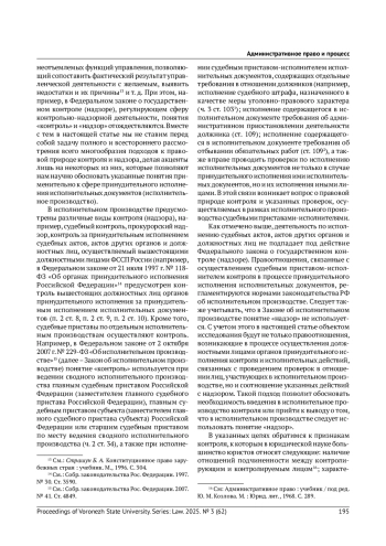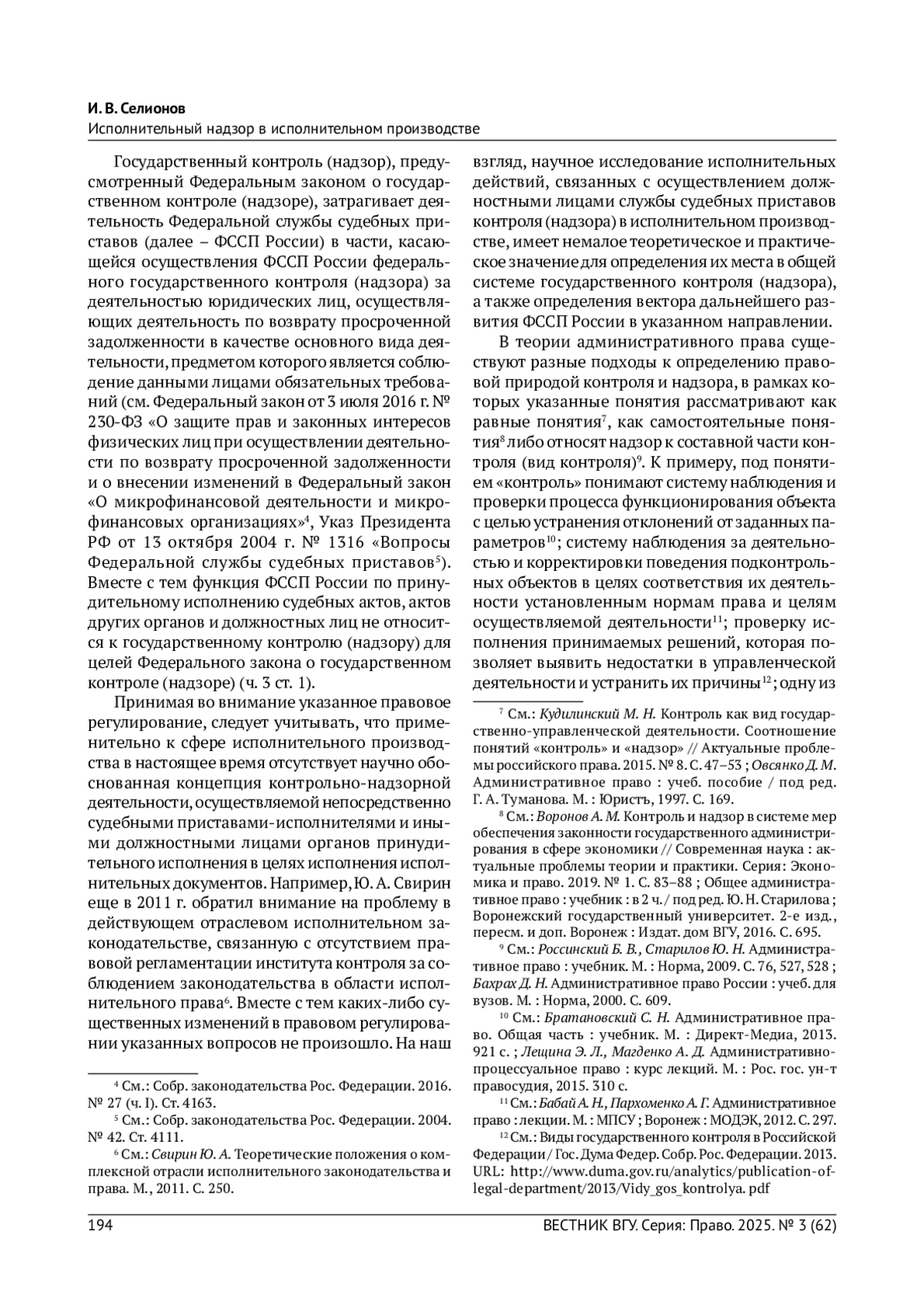 7. Воронов А. М. Контроль и надзор в системе мер обеспечения законности государственного администрирования в сфере экономики // Современная наука: актуальные проблемы теории и практики. Серия: Экономика и право. 2019. № 1. C. 83-88. EDN: PPGMOH