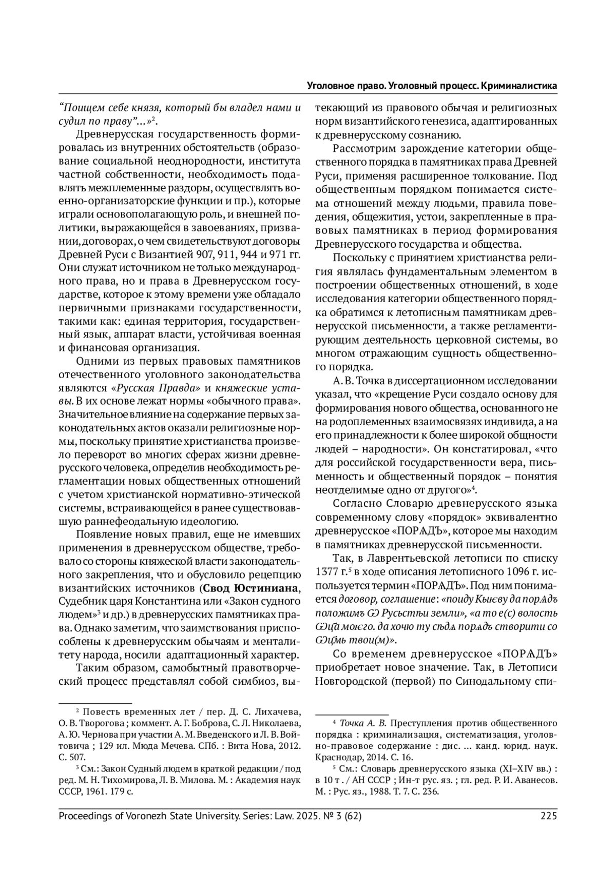 Представлены результаты исследования категории общественного порядка в раннефеодальном уголовном законодательстве с апеллированием к иным памятникам древнерусской письменности, в которых раскрыта содержательная сторона порядка в обществе того периода. Обосновывается вывод о влиянии христианско-нравственной морали на правила жития в сферах общественной жизни, включая брачно-семейные отношения, определяя отношения между сословиями и в сфере государственного управления в целях формирования нравственных отношений между членами общества.
