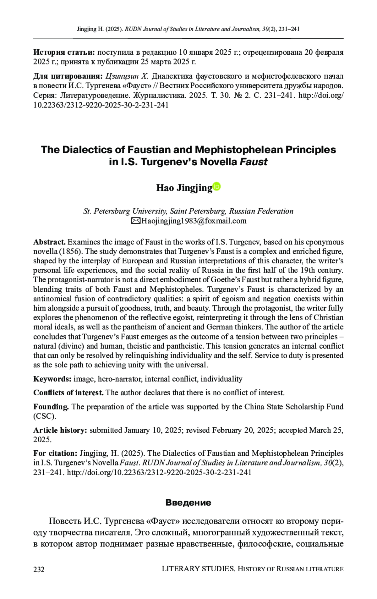 Цель исследования - установление различных факторов, благодаря которым образ Фауста в одноименной повести Тургенева усложняется и обогащается как результат взаимодействия русского и европейского типов сознания, а также благодаря проекции в этом образе личного жизненного опыта Тургенева и его восприятия социальной обстановки в России первой половины XIX в. Показано, что герой-повествователь не воплощен в образ Фауста Гёте непосредственно, а являет собой некий гибридный образ, в котором сочетаются черты Фауста и Мефистофеля. В ходе сравнительно-сопоставительного анализа доказывается, что тургеневский Фауст антиномически совмещает противоположные качества: эгоизм и нигилизм соединяются в нем со стремлением к добру, тягой к истине и красоте. В образе главного героя повести «Фауст» Тургенев раскрывает феномен постоянно рефлексирующего эгоиста, осмысляя его в свете христианских моральных идеалов, а также пантеизма, античной и немецкой философии. В результате исследования делается вывод о том, что тургеневский образ Фауста порожден противостоянием двух начал бытия, природного (Бога) и человеческого, теистического и пантеистического. Этим противостоянием порождается внутренний конфликт, который может быть преодолен только путем отказа от собственной индивидуальности, от своего «я». Единственный способ достичь единства со всем сущим для Фауста Тургенева - это служение своему долгу.