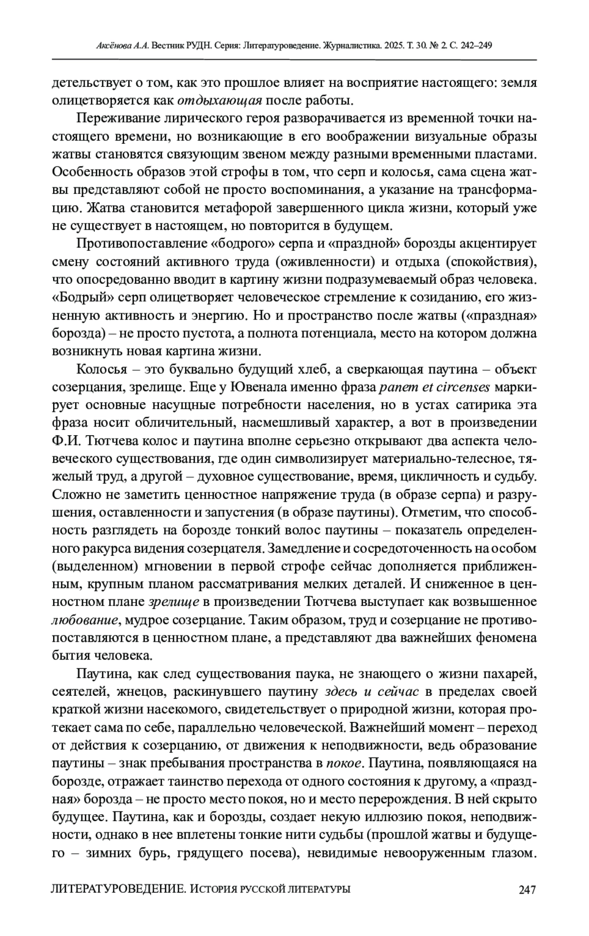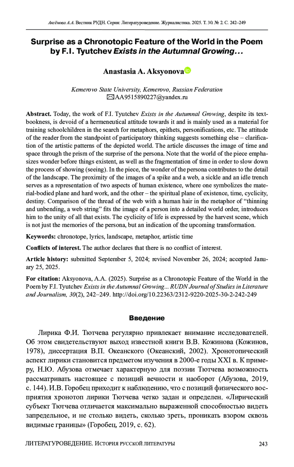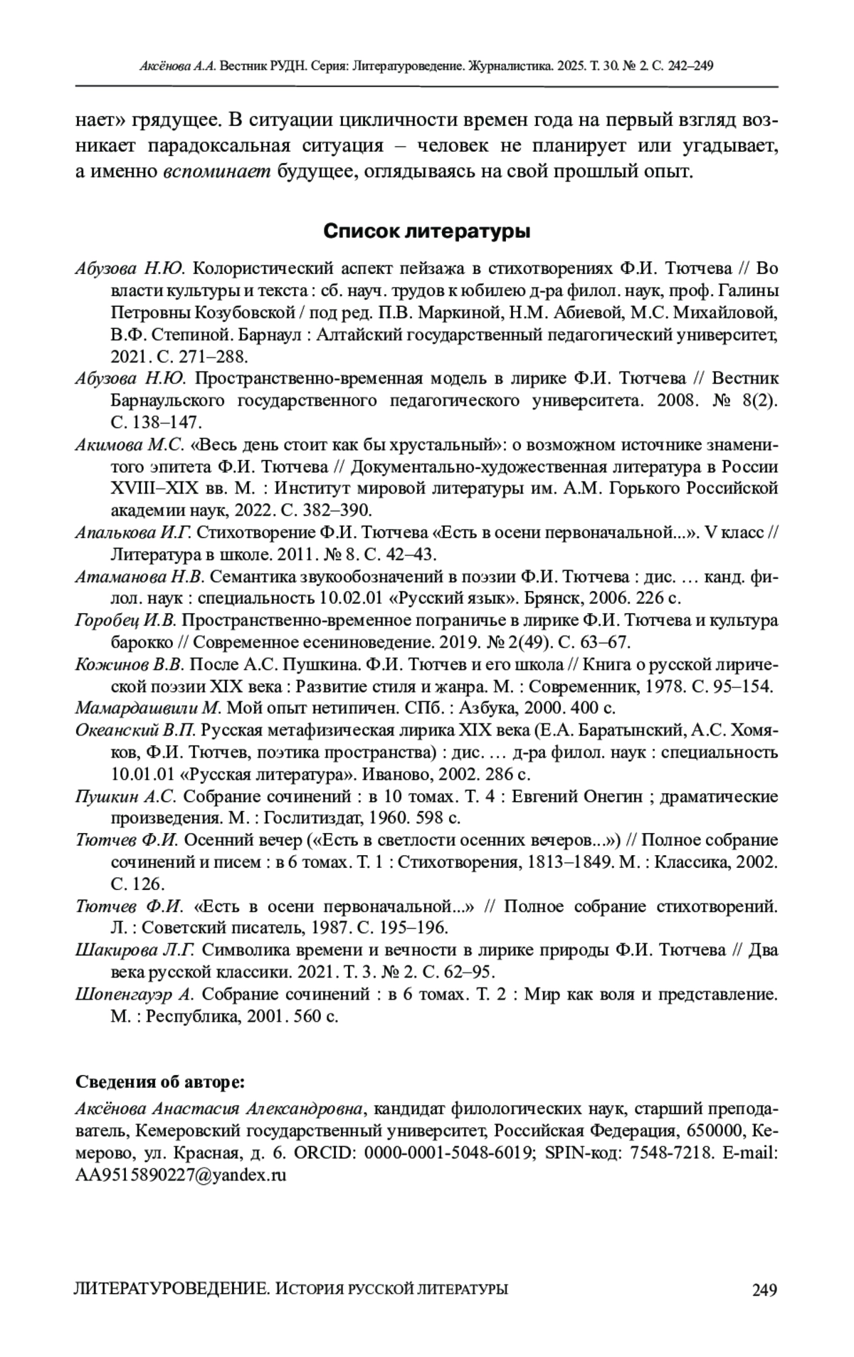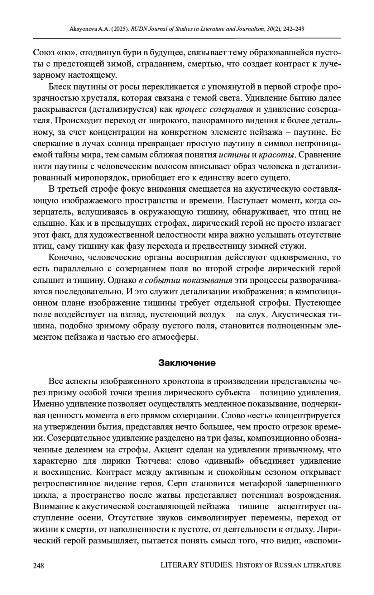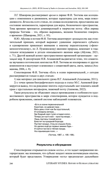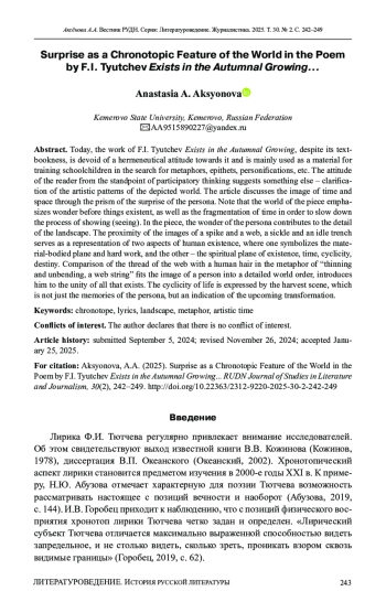 АКСЁНОВА А. А. УДИВЛЕНИЕ КАК ХРОНОТОПИЧЕСКАЯ ОСОБЕННОСТЬ МИРА В СТИХОТВОРЕНИИ Ф. И. ТЮТЧЕВА «ЕСТЬ В ОСЕНИ ПЕРВОНАЧАЛЬНОЙ...» // ВЕСТНИК РОССИЙСКОГО УНИВЕРСИТЕТА ДРУЖБЫ НАРОДОВ. СЕРИЯ: ЛИТЕРАТУРОВЕДЕНИЕ. ЖУРНАЛИСТИКА. 2025. ТОМ 30 № 2