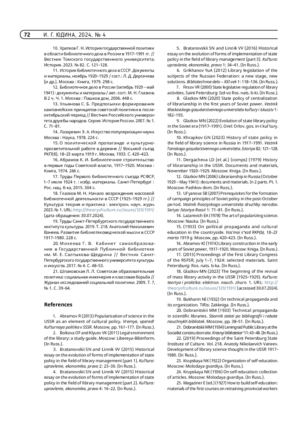 10. Храпков Г. Н. История государственной политики в области библиотечного дела в России в 1917-1991 гг. // Вестник Томского государственного университета. История. 2023. № 82. С. 121-128.