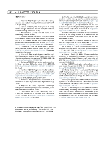 4. Бородина В. А., Тургаев А. С. Концептуальные основы читателеведения в трудах А. Н. Ванеева и В. С. Крейденко // Вестник Санкт-Петербургского государственного института культуры. 2019. № 4. С. 160-166. https://doi.org/10.30725/2619-0303-2019-4-160-166.