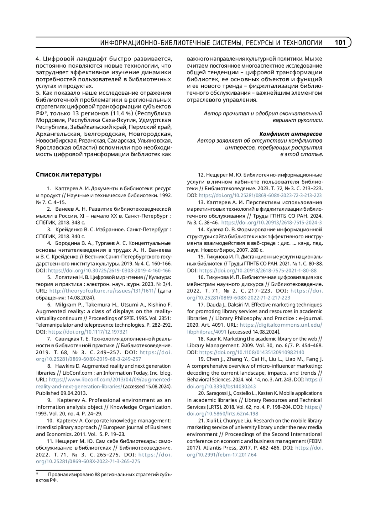 13. Каптерев А. И. Перспективы использования маркетинговых технологий в фиджитализации библиотечного обслуживания // Труды ГПНТБ СО РАН. 2024. № 3. С. 38-46. https://doi.org/10.20913/2618-7515-2024-3-38-46.