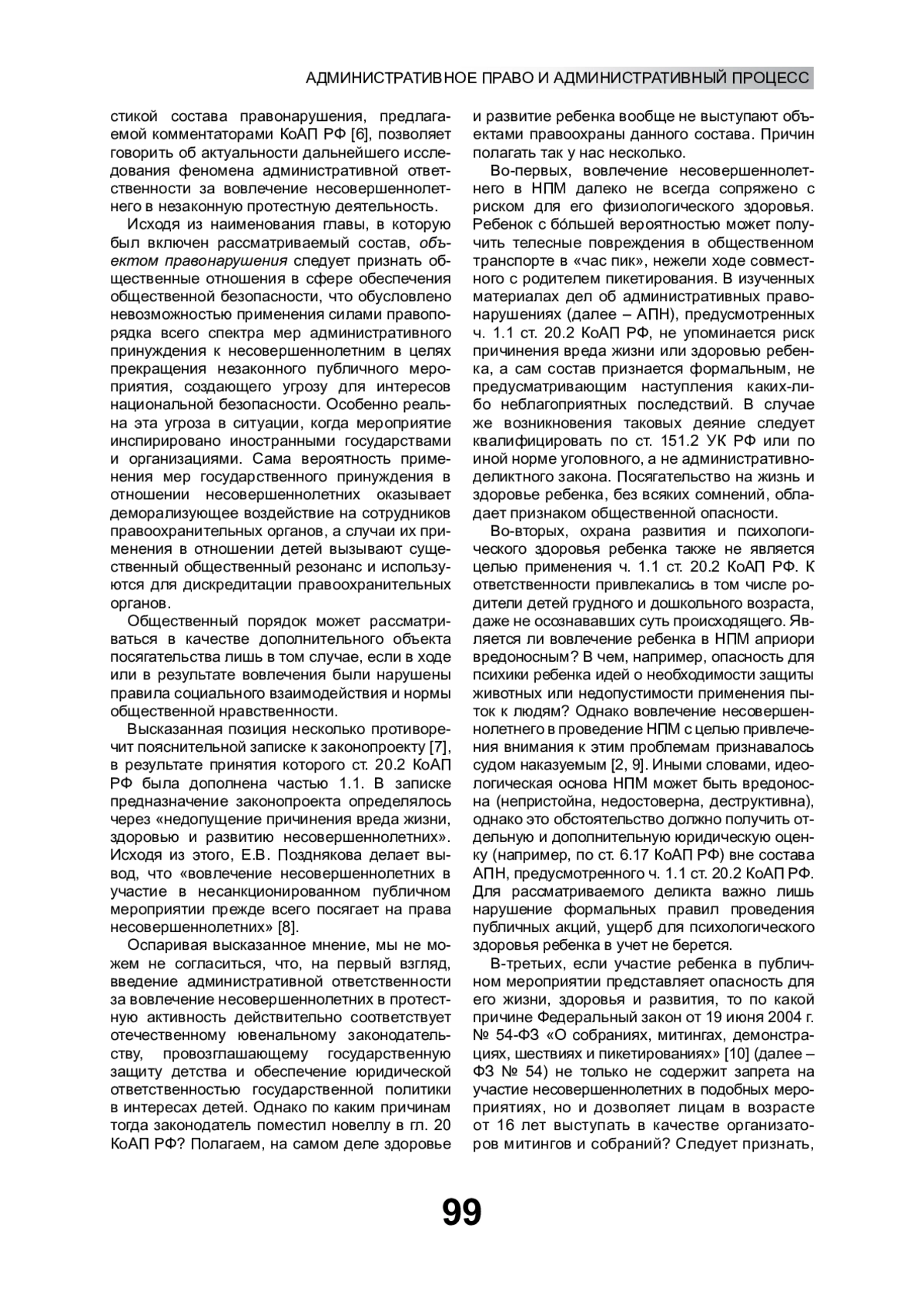 8. Позднякова Е.В. Вовлечение несовершеннолетних в участие в несанкционированных публичных мероприятиях: административно-правовой аспект // Вестник Воронежского института МВД России. 2022. № 2. С. 234-237. EDN: MROUGP