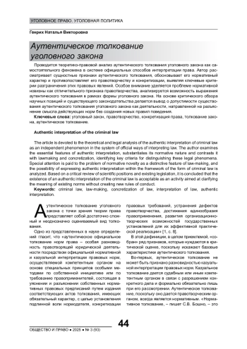 Проводится теоретико-правовой анализ аутентического толкования уголовного закона как самостоятельного феномена в системе официальных способов интерпретации права. Автор рассматривает сущностные признаки аутентического толкования, обосновывает его нормативный характер и противопоставляет его правотворчеству и конкретизации, выявляя ключевые критерии разграничения этих правовых явлений. Особое внимание уделяется проблеме нормативной новизны как отличительного признака правотворчества, анализируется возможность выражения аутентического толкования в рамках формы уголовного закона. На основе критического обзора научных позиций и существующего законодательства делается вывод о допустимости существования аутентического толкования уголовного закона как деятельности, направленной на разъяснение смысла действующих норм без создания новых правил поведения.