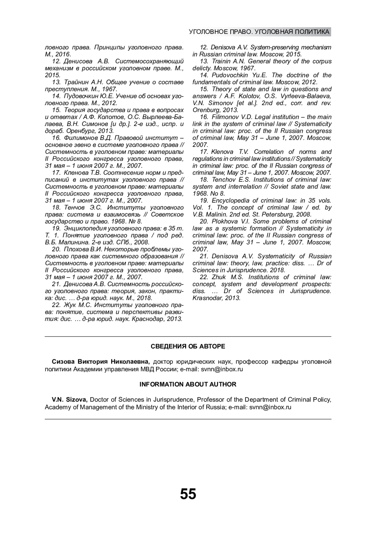 21. Денисова А.В. Системность российского уголовного права: теория, закон, практика: дис. … д-ра юрид. наук. М., 2018. EDN: YUXMFB
