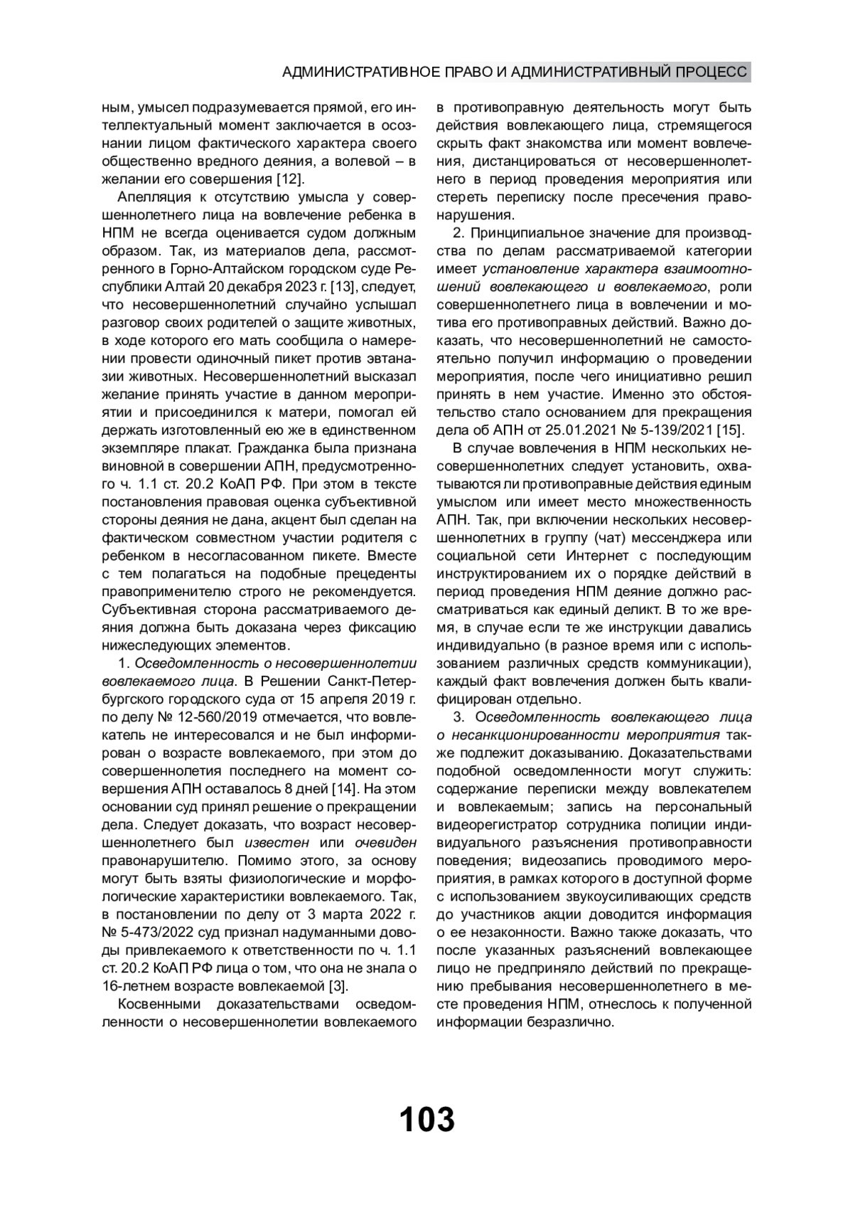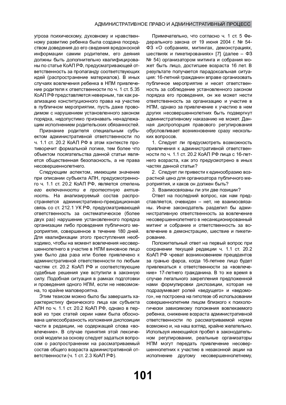 В ранее опубликованной научной статье [1] нами рассмотрены объект и объективная сторона деликта, предусмотренного ч. 1.1 ст. 20.2 КоАП РФ. С учетом раскрытой в ней научно-теоретической и эмпирической базы в настоящей работе будут рассмотрены субъект и субъективная сторона данного административного правонарушения (далее – АПН). Сформулированные выводы и замечания будут способствовать повышению эффективности противодействия вовлечению несовершеннолетних в участие в несанкционированных публичных мероприятиях (далее – НПМ).