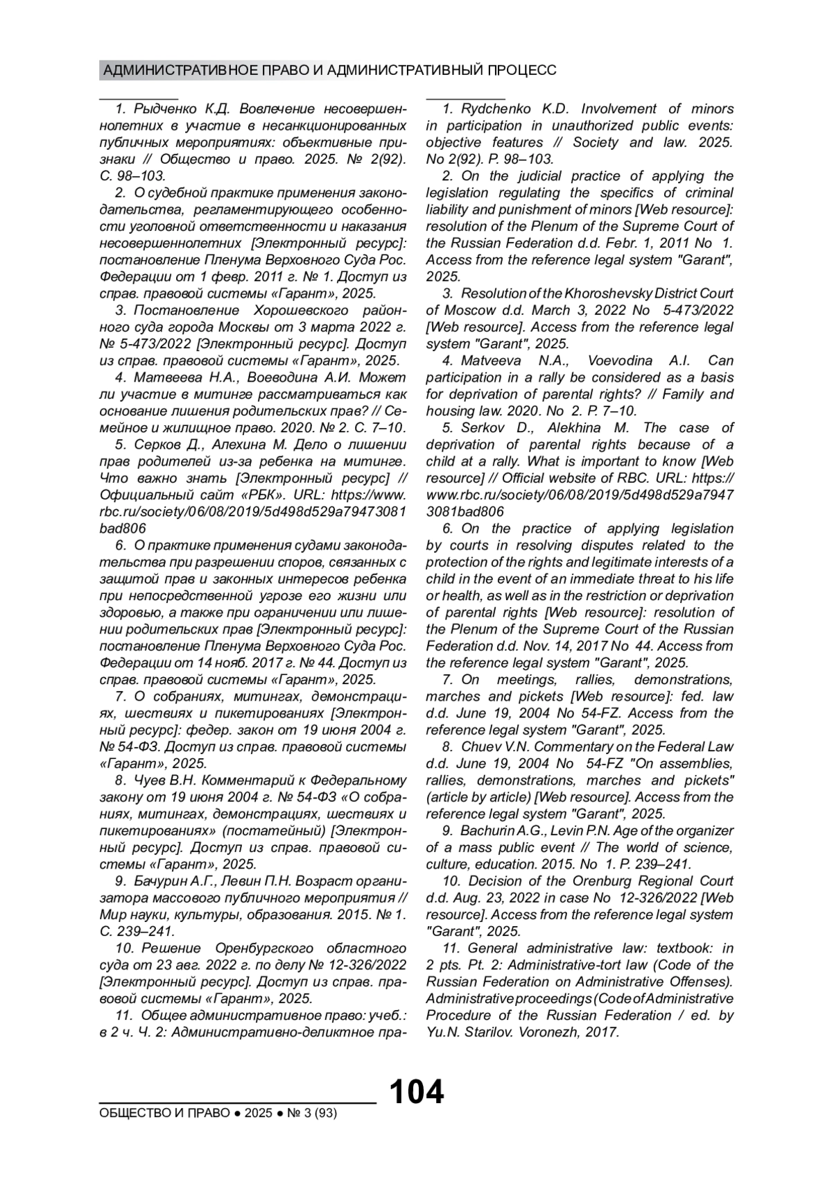 1. Рыдченко К.Д. Вовлечение несовершеннолетних в участие в несанкционированных публичных мероприятиях: объективные признаки // Общество и право. 2025. № 2(92). С. 98-103. EDN: KSZNNM
