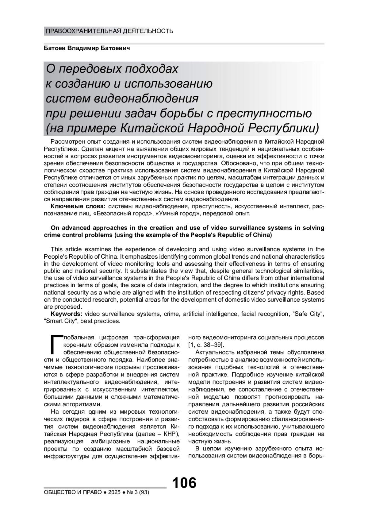 Глобальная цифровая трансформация коренным образом изменила подходы к обеспечению общественной безопасности и общественного порядка. Наиболее значимые технологические прорывы прослеживаются в сфере разработки и внедрения систем интеллектуального видеонаблюдения, интегрированных с искусственным интеллектом, большими данными и сложными математическими алгоритмами