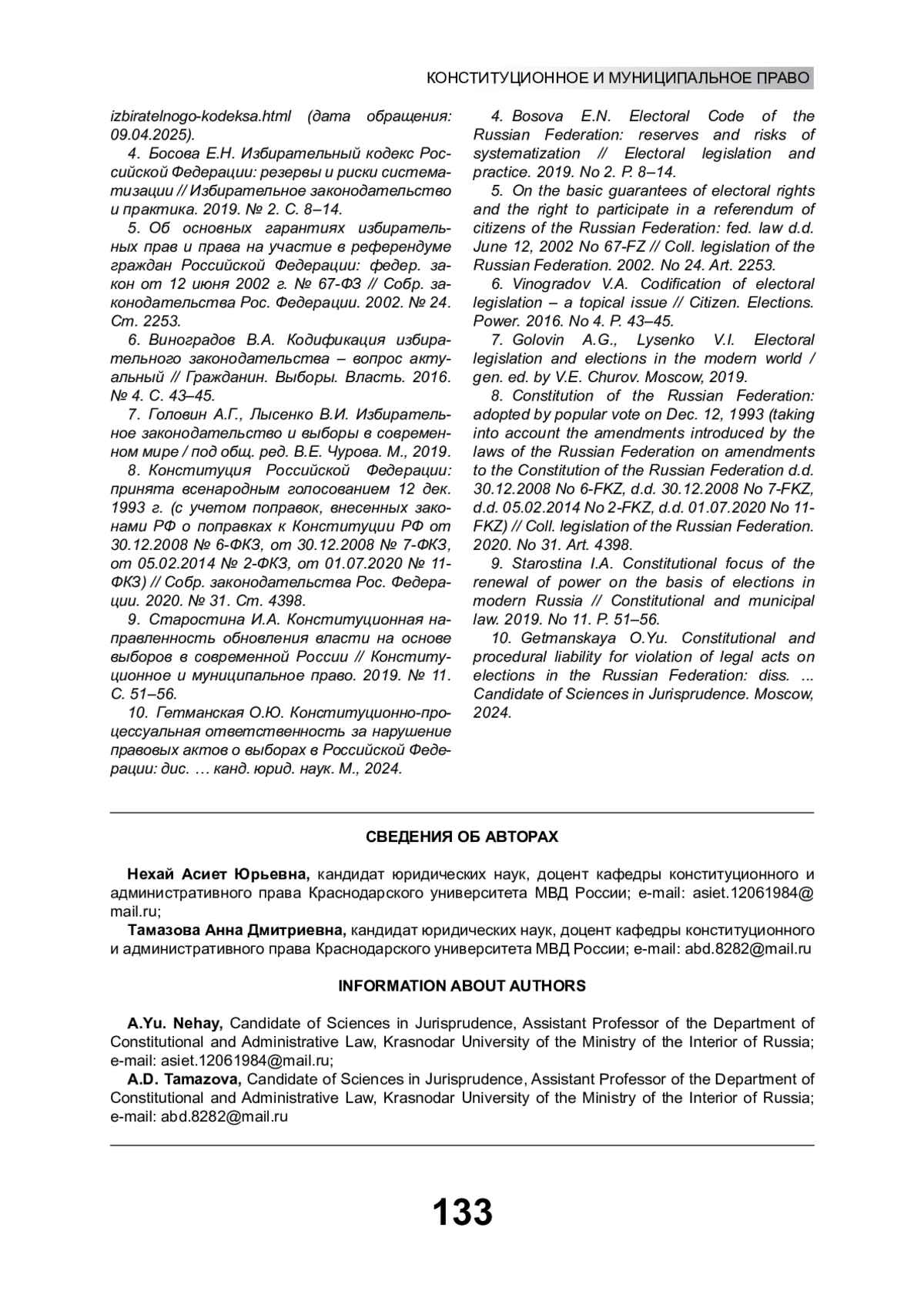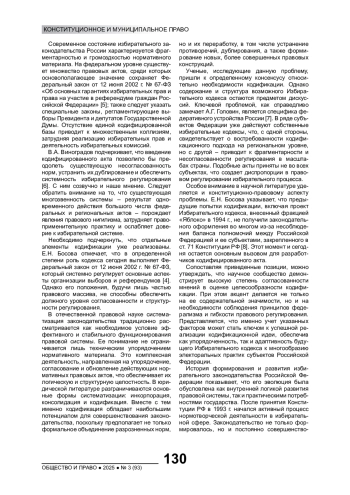 4. Босова Е.Н. Избирательный кодекс Российской Федерации: резервы и риски систематизации // Избирательное законодательство и практика. 2019. № 2. С. 8-14. EDN: DCQCNA