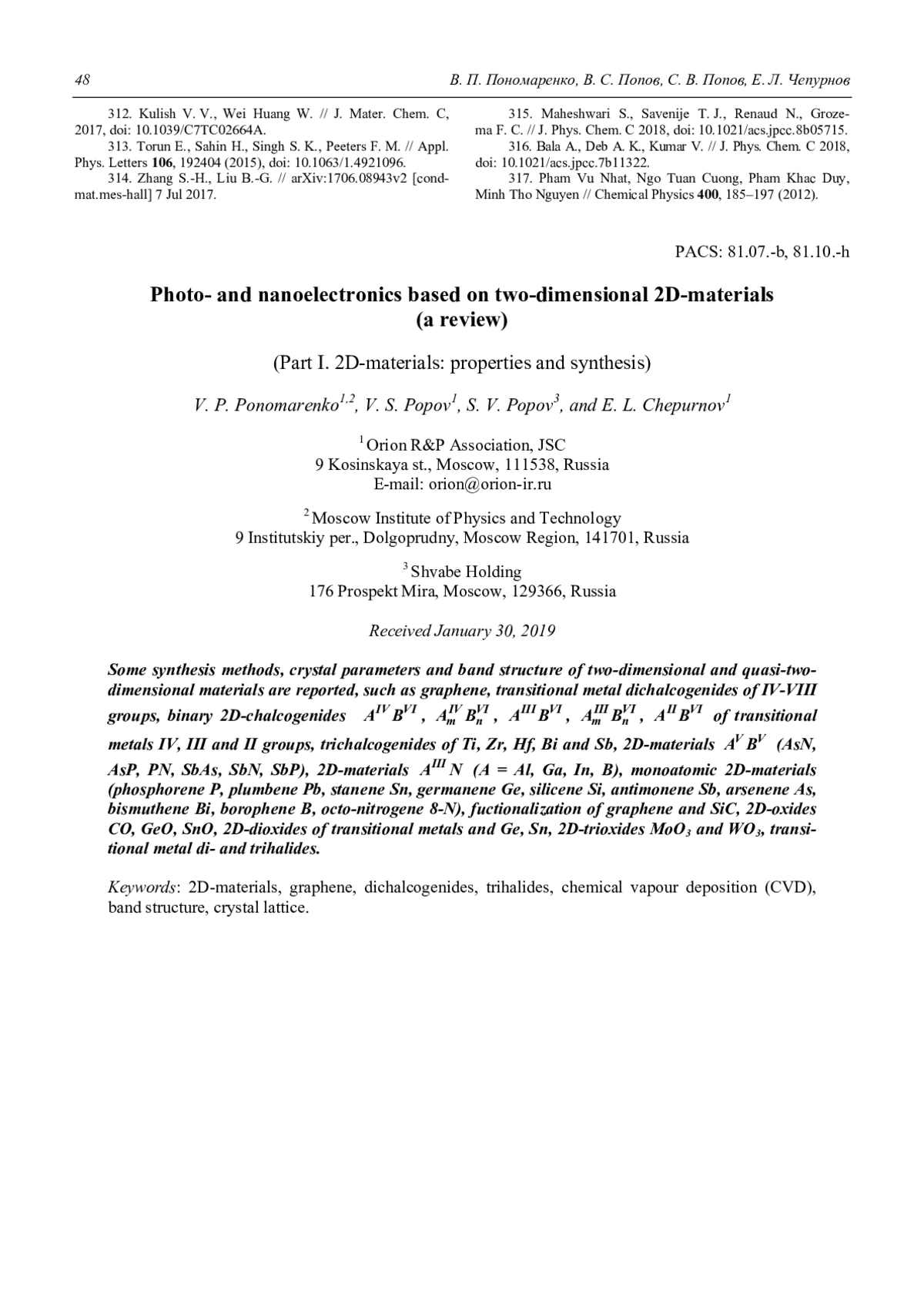 Несмотря на обнаруженные многообещающие свойства многих двумерных материалов, их широкое внедрение в нано- и фотоэлектронику требует поиска 2D-наноструктур, оптимальных с точки зрения оптических, фотоэлектрических и структурных свойств. В статье представлен обзор результатов теоретических и экспериментальных работ, опубликованных в последнее время по синтезу и изучению структурных и электронных свойств двумерных и квазидвумерных материалов с целью уточнения наиболее оптимальных способов и областей их применения в нано- и фотоэлектронике.