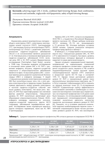 Цель: изучить влияние фиксированной комбинации розувастатин + эзетимиб на показатели липидного профиля, включая триглицерид-богатые липопротеиды, у пациентов различных клинических групп и оценить безопасность назначения данной терапии.