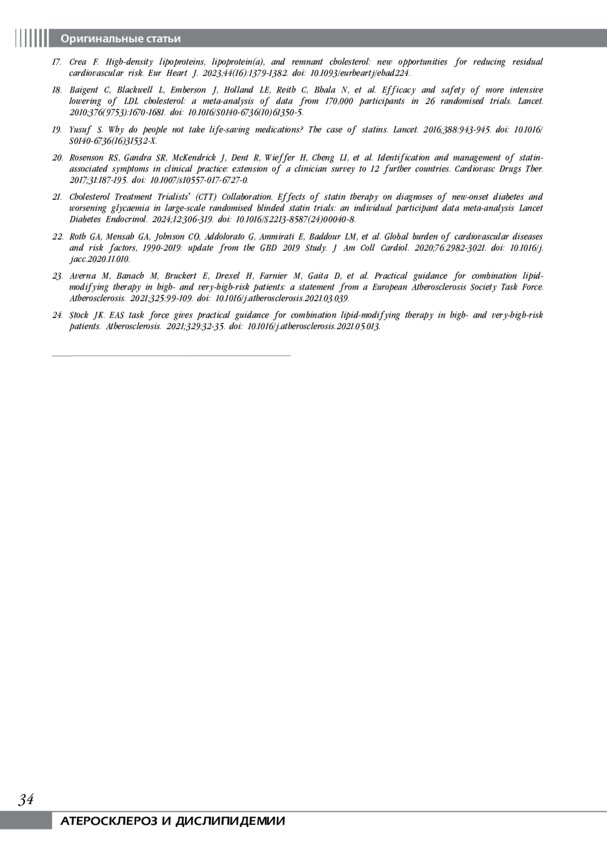 17. Crea F. High-density lipoproteins, lipoprotein(a), and remnant cholesterol: new opportunities for reducing residual cardiovascular risk. Eur Heart J. 2023;44(16):1379-1382. DOI: 10.1093/eurheartj/ehad224 EDN: RIRBBI