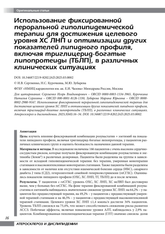6. Sergienko IV, Ezhov MV, Gurevich VS, Zafiraki VK, Barov OV, Tsygankova EA, et al.Comparative efficacy and safety of statins monotherapy and their combination with ezetimibe (Results of the Russian retrospective observational study UNISON. Atherosclerosis and dyslipidemias. 2022;4(49):25-39. In Russian.