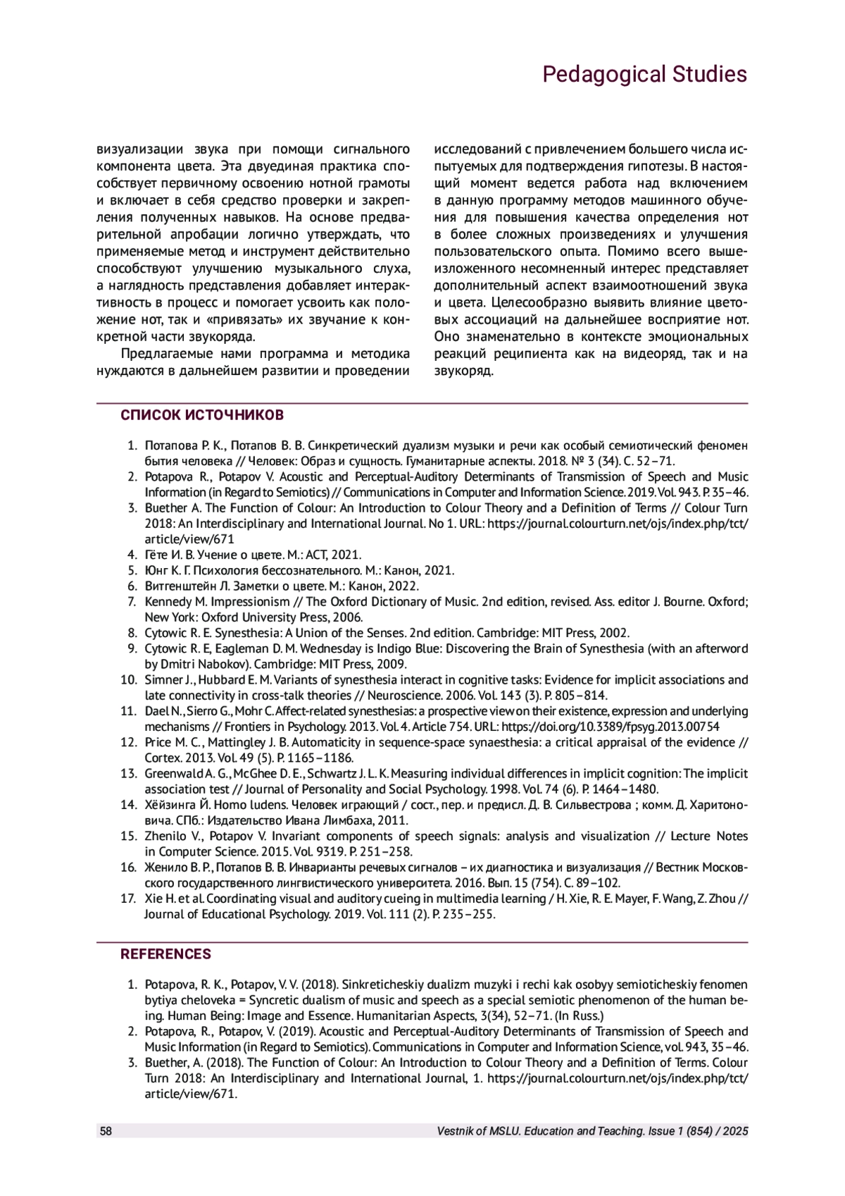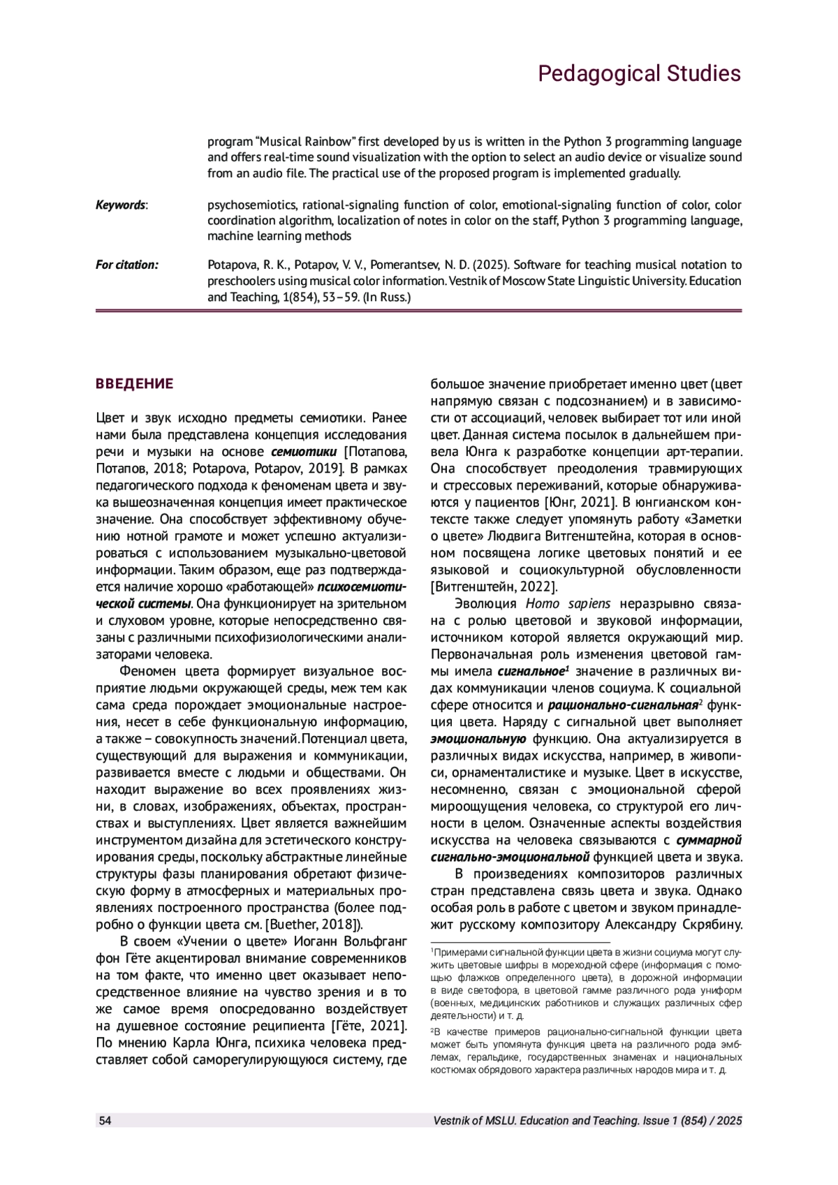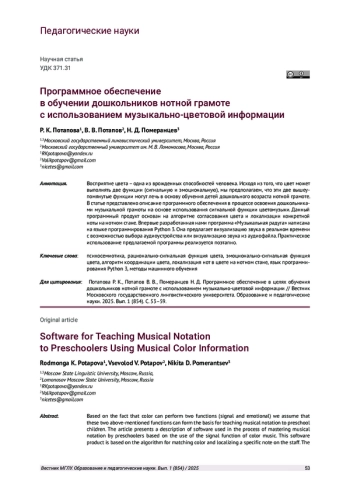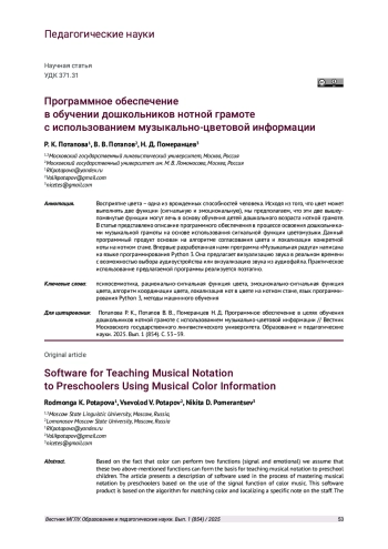 ПОТАПОВА Р. К., ПОТАПОВ В. В., ПОМЕРАНЦЕВ Н. Д. ПРОГРАММНОЕ ОБЕСПЕЧЕНИЕ В ОБУЧЕНИИ ДОШКОЛЬНИКОВ НОТНОЙ ГРАМОТЕ С ИСПОЛЬЗОВАНИЕМ МУЗЫКАЛЬНО-ЦВЕТОВОЙ ИНФОРМАЦИИ // ВЕСТНИК МОСКОВСКОГО ГОСУДАРСТВЕННОГО ЛИНГВИСТИЧЕСКОГО УНИВЕРСИТЕТА. ОБРАЗОВАНИЕ И ПЕДАГОГИЧЕСКИЕ НАУКИ. 2025. № 1 (854)