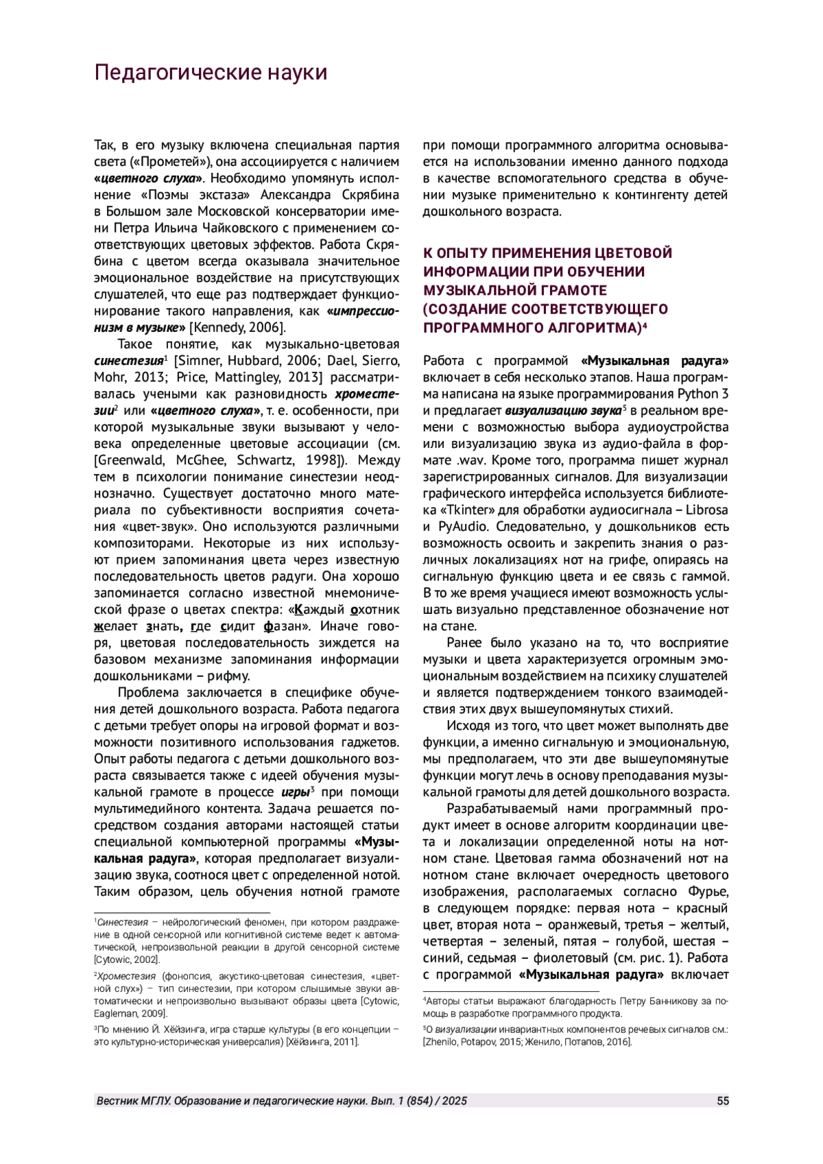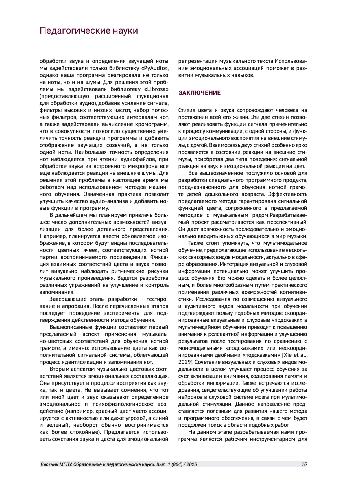 Статья: ПРОГРАММНОЕ ОБЕСПЕЧЕНИЕ В ОБУЧЕНИИ ДОШКОЛЬНИКОВ НОТНОЙ ГРАМОТЕ С ИСПОЛЬЗОВАНИЕМ МУЗЫКАЛЬНО-ЦВЕТОВОЙ ИНФОРМАЦИИ (2025)