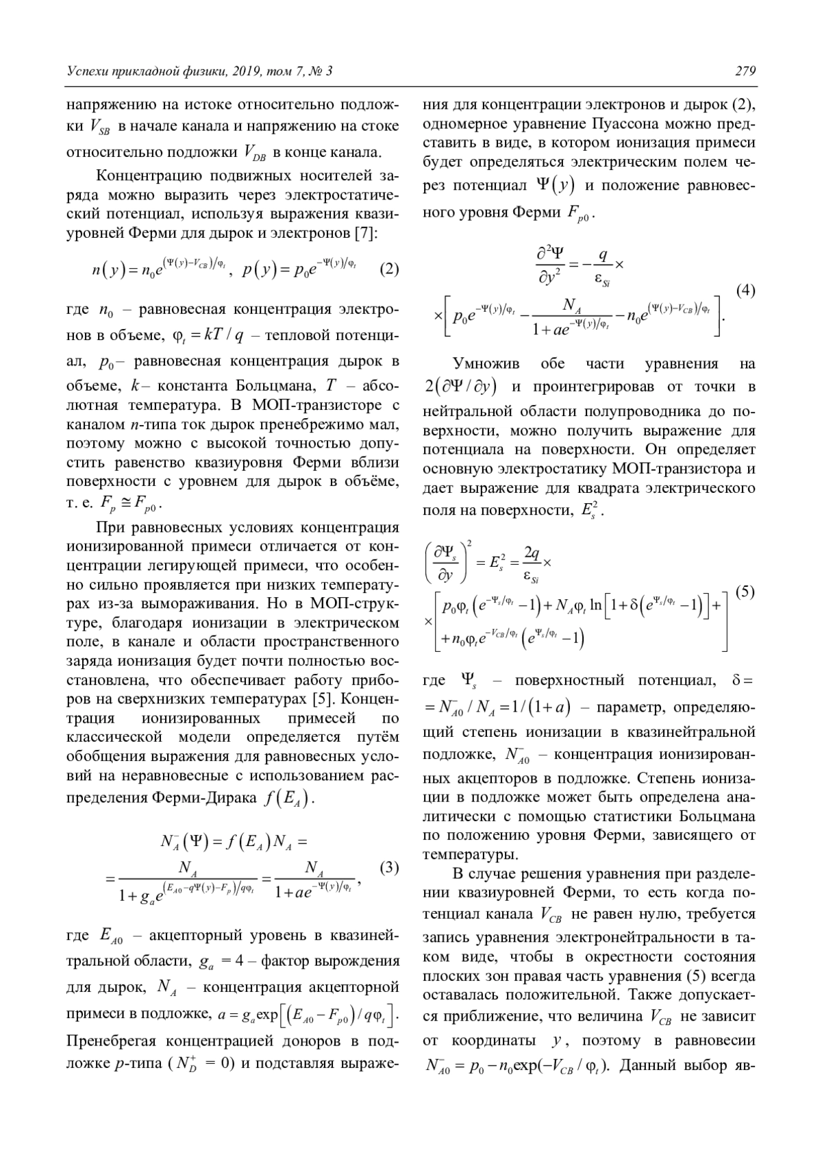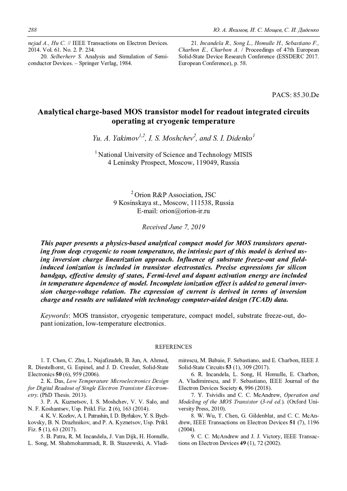 В работе представлена физическая аналитическая компактная модель МОП-транзистора, работающего от комнатной до глубоко криогенной температуры, основанная на линеаризации заряда инверсионного слоя. Показано влияние вымораживания подложки и ионизации примеси, индуцированной полем, на электростатику транзистора. Температурное масштабирование ядра модели было получено с использованием точных уравнений для ширины запрещенной зоны, эффективной плотности состояний, уровня Ферми, энергии ионизации. Основное соотношение для инверсионного заряда с внешними напряжениями было дополнено эффектом неполной ионизации. Выведено уравнение для тока канала через инверсионные заряды, и расчеты были подтверждены с помощью приборно-технологического модели-рования в TCAD.