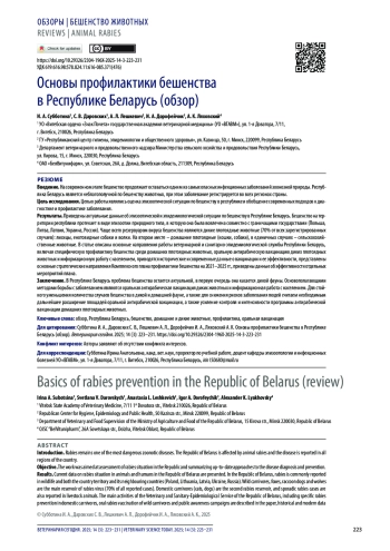 Результаты. Приведены актуальные данные об эпизоотической и эпидемиологической ситуации по бешенству в Республике Беларусь. Бешенство на территории республики протекает в виде эпизоотии природного типа, в которую она была вовлечена совместно с граничащими государствами (Польша, Литва, Латвия, Украина, Россия). Чаще всего резервуаром вируса бешенства являются дикие плотоядные животные (70% от всех зарегистрированных случаев): лисицы, енотовидные собаки и волки. На втором месте – домашние плотоядные (кошки, собаки), в единичных случаях – сельскохозяйственные животные. В статье описаны основные направления работы ветеринарной и санитарно-эпидемиологической службы Республики Беларусь, включая специфическую профилактику бешенства среди домашних плотоядных животных, оральную антирабическую вакцинацию диких плотоядных животных и информационную работу с населением, приводятся исторические и современные данные о вакцинации и ее эффективности, представлены основные стратегические направления Комплексного плана профилактики бешенства на 2021–2025 гг., приведены данные об эффективности отдельных мероприятий плана.