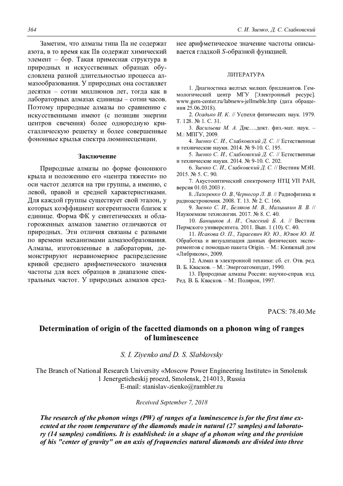 Впервые выполнено исследование фононных крыльев (ФК) спектров люминесценции, при комнатной температуре алмазов, изготовленных в природных (27 образцов) и лабораторных (14 образцов) условиях. Установлено, что по форме фононного крыла и положению его «центра тяжести» по оси частот природные алмазы делятся на три группы: с левой, правой и средней характеристиками. Для каждой группы существует свой эталон, у которых коэффициент когерентности близок к единице. Форма ФК у синтетических и облагороженных алмазов заметно отличаются от природных алмазов. Эти отличия связаны с разными по времени механизмами алмазообразования. Алмазы, изготовленные в лаборатории, демонстрируют неравномерное распределение кривой среднего арифметического значения частоты для всех образцов в диапазоне частот. У природных алмазов среднее арифметическое значение частоты описывается гладкой S-образной функцией.