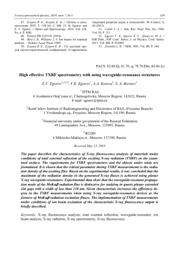 В работе дана характеристика метода рентгенофлуоресцентного анализа в условиях полного отражения потока возбуждения (РФА ПВО) и выделен критический параметр, определяющий степень его эффективности. Показано, что в соответствии с этим критерием максимум эффективности РФА ПВО спектрометрии достигается при формировании потока возбуждения плоским рентгеновским волноводом-резонатором. Поскольку в РФА ПВО измерениях наиболее часто используется в качестве потока возбуждения излучение MoK, приведены данные систематических исследований, на основании которых установлено, что щелевой зазор кварцевого ПРВР под это излучение должен быть меньше 110 нанометров. Кратко описана модернизация РФА при ионном возбуждении (PIXE спектрометрия) для осуществления элементной диагностики поверхностного слоя изучаемого объекта толщиной 3–5 нм, т. е. создание нового метода эффективного элементного анализа поверхности материалов – РФА ПВО РВ (TXRF-PIXE).