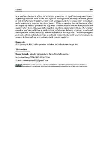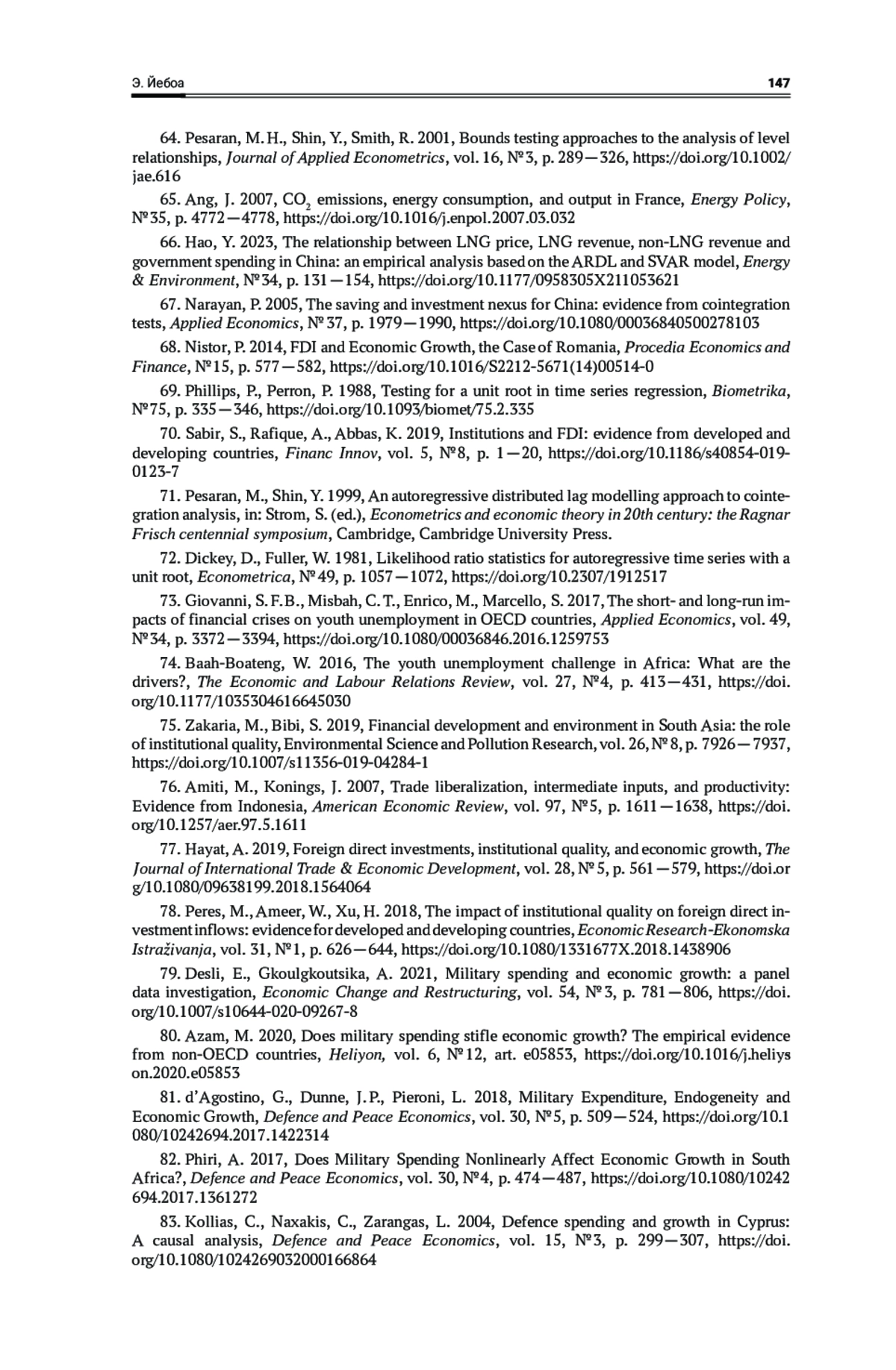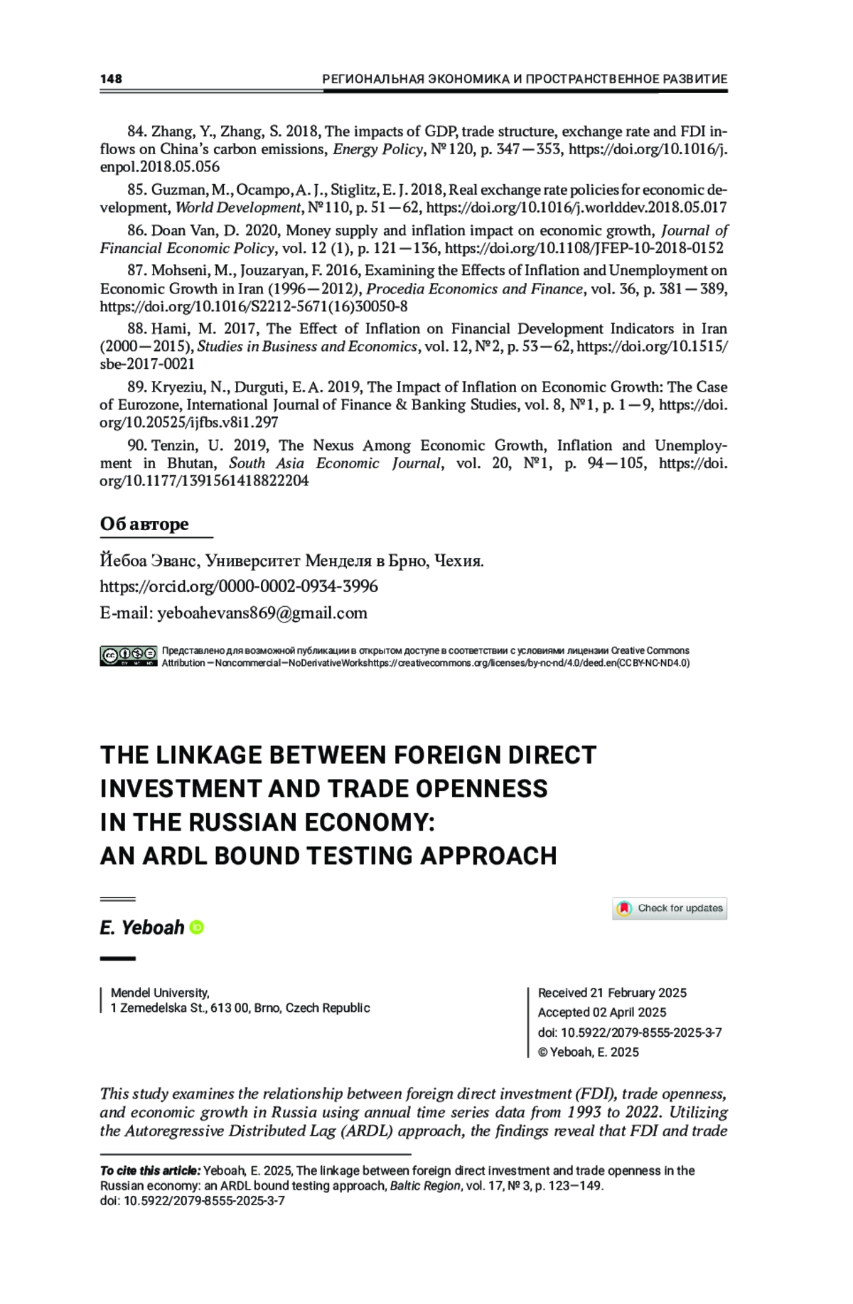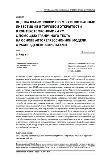 YEBOAH E. ОЦЕНКА ВЗАИМОСВЯЗИ ПРЯМЫХ ИНОСТРАННЫХ ИНВЕСТИЦИЙ И ТОРГОВОЙ ОТКРЫТОСТИ В КОНТЕКСТЕ ЭКОНОМИКИ РФ С ПОМОЩЬЮ ГРАНИЧНОГО ТЕСТА НА ОСНОВЕ АВТОРЕГРЕССИОННОЙ МОДЕЛИ С РАСПРЕДЕЛЕННЫМИ ЛАГАМИ // БАЛТИЙСКИЙ РЕГИОН. 2025. Т. 17, № 3