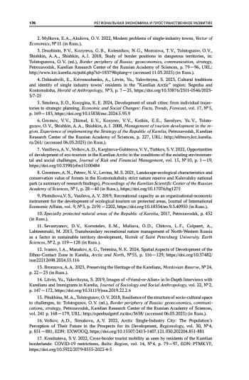 7. Vasilieva, A. V., Volkov, A. D., Karginova-Gubinova, V. V., Tishkov, S. V. 2022, Opportunities of development of eco-tourism in the Karelian Arctic in the conditions of the existing environmental and social challenges, Journal of Risk and Financial Management, vol. 15, No 10, p. 1—19,EDN: VEJPLS, https://doi.org/10.3390/jrfm15100484