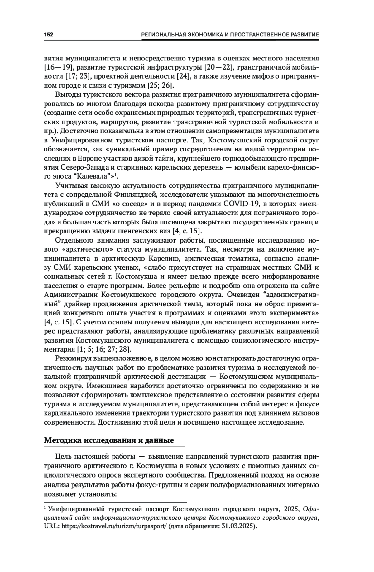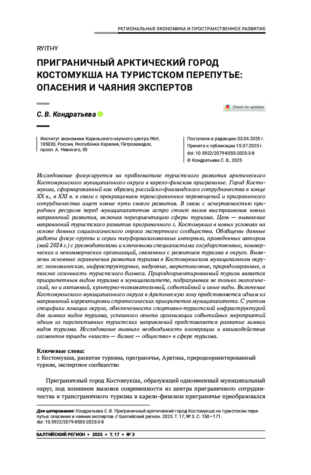 Исследование фокусируется на проблематике туристского развития арктического Костомукшского муниципального округа в карело-финском приграничье. Город Костомукша, сформированный как образец российско-финляндского сотрудничества в конце XX в., в XXI в. в связи с прекращением трансграничных перемещений и приграничного сотрудничества ищет новые пути своего развития. В связи с исчерпаемостью природных ресурсов перед муниципалитетом остро стоит вызов выстраивания новых направлений развития, включая переориентацию сферы туризма. Цель — выявление направлений туристского развития приграничного г. Костомукша в новых условиях на основе данных социологического опроса экспертного сообщества. Обобщены данные работы фокус-группы и серии полуформализованных интервью, проведенных автором (май 2024 г.) с руководителями и ключевыми специалистами государственных, коммерческих и некоммерческих организаций, связанных с развитием туризма в округе. Выявлены основные ограничения развития туризма в Костомукшском муниципальном округе: экономические, инфраструктурные, кадровые, маркетинговые, природоохранные, а также сезонность туристского бизнеса. Природоориентированный туризм является приоритетным видом туризма в муниципалитете, подразумевая не только экологический, но и активный, культурно-познавательный, событийный и иные виды. Включение Костомукшского муниципального округа в Арктическую зону представляется одним из направлений корректировки стратегических приоритетов муниципалитета. С учетом специфики локации округа, обеспеченности спортивно-туристской инфраструктурой для зимних видов туризма, успешного опыта организации событийных мероприятий одним из перспективных туристских направлений представляется развитие зимних видов туризма. Исследование выявило необходимость кооперации и взаимодействия сегментов триады «власть — бизнес — общество» в сфере туризма.