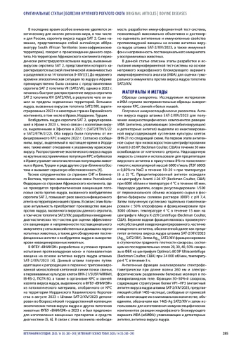 Цель исследования. Разработка и испытание иммуноферментной тест-системы на основе непрямого жидкофазного блокирующего варианта иммуноферментного анализа для определения антител к структурным белкам вируса ящура топотипа SAT2/XIV для оценки эффективности противоящурной вакцины на основе антигена вируса ящура штамма SAT-2/XIV/2023 при ее производстве и последующем применении.
