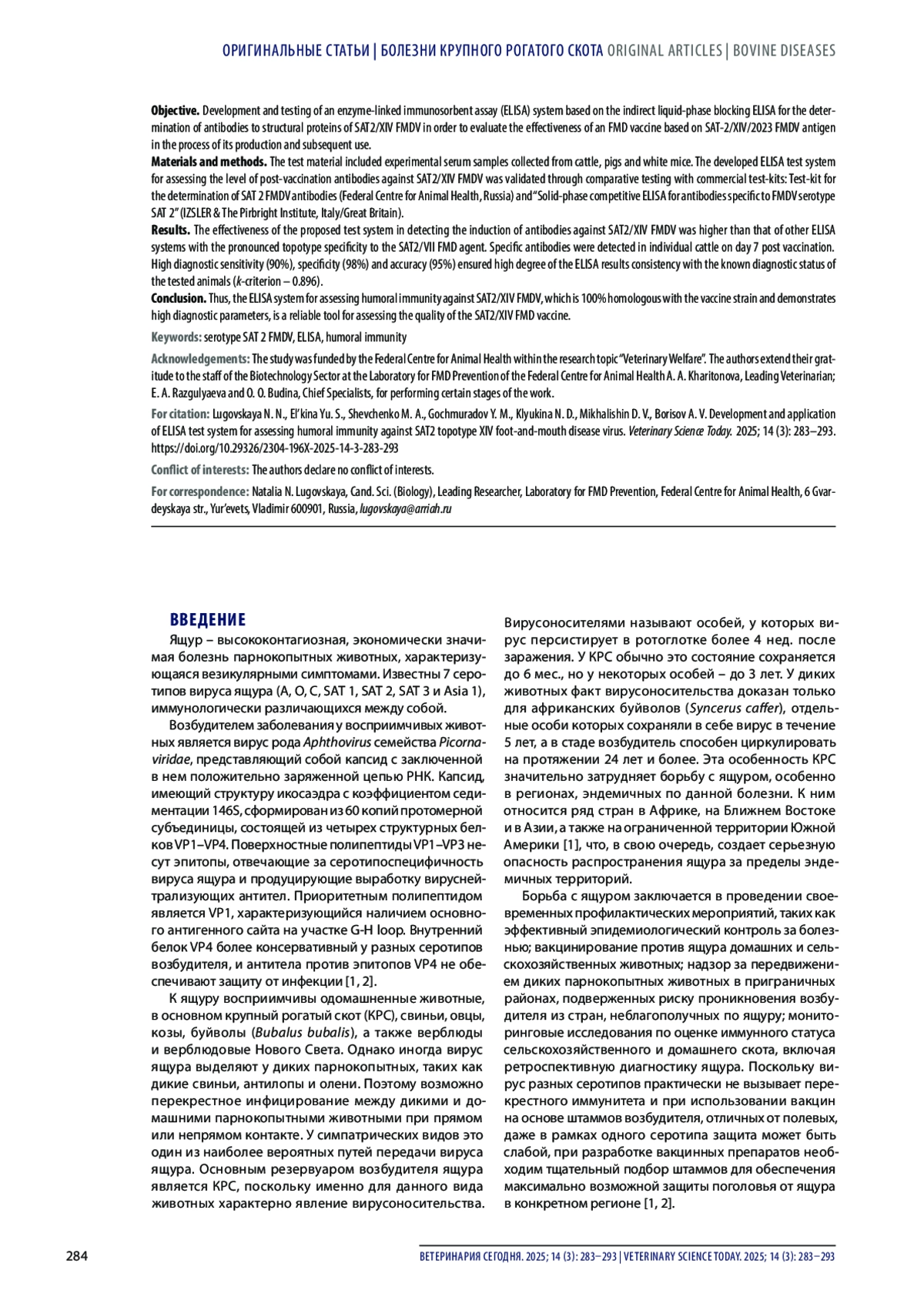Введение. Ящур – высококонтагиозная, экономически значимая болезнь парнокопытных животных, характеризующаяся везикулярными симптомами. Известны 7 серотипов вируса ящура (A, O, C, SAT 1, SAT 2, SAT 3 и Asia 1), иммунологически отличающихся между собой. В последнее время особое внимание уделяется топотипу вируса ящура SAT2/XIV (South African Territories 2) ввиду его быстрого распространения. Одними из основных методов борьбы с ящуром являются вакцинопрофилактика и оценка иммунного статуса поголовья восприимчивых животных.