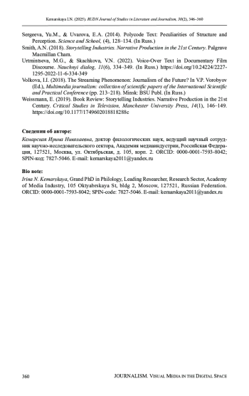 15. Уртминцева М.Г., Скачкова В.Н. Закадровый текст в документальном кинодискурсе // Научный диалог. 2022. Т. 11. № 6. С. 334-349. EDN: EPNIRK