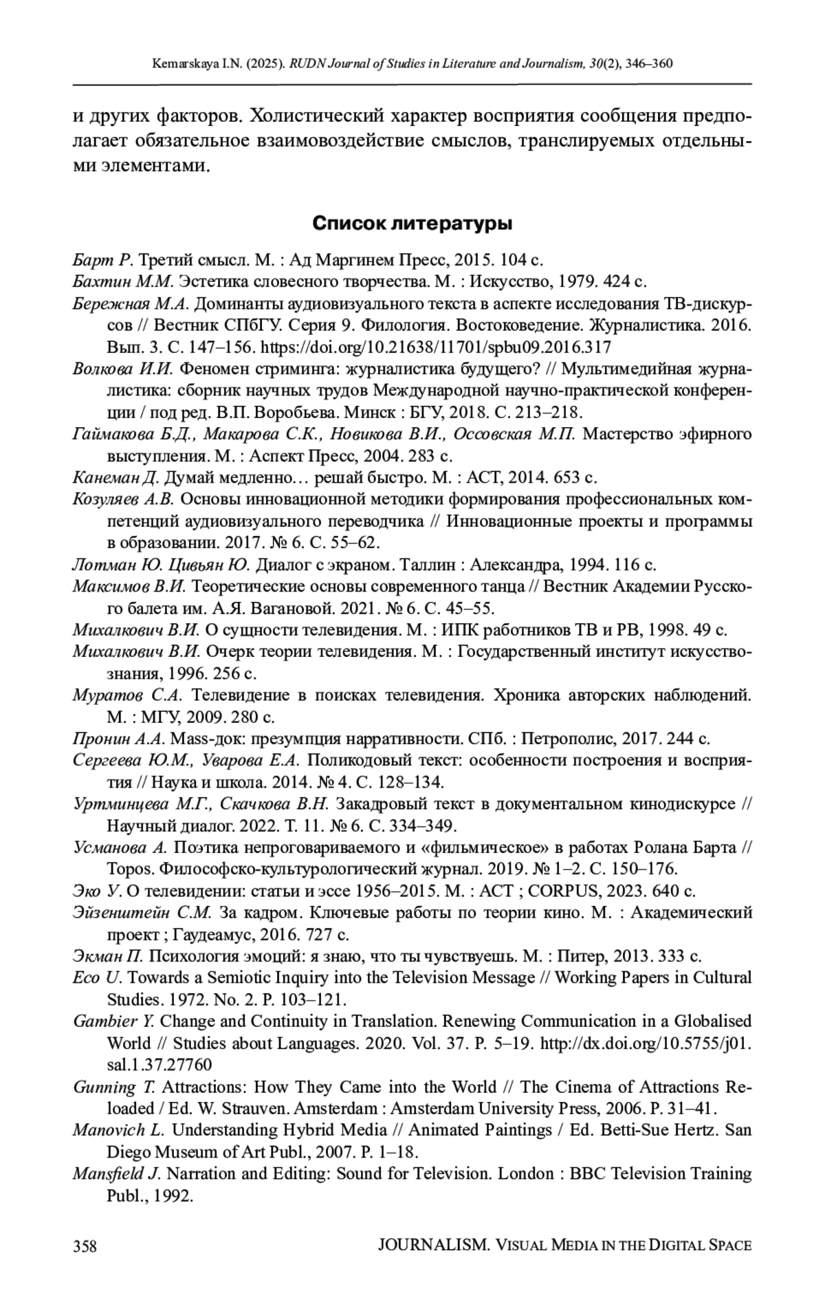 3. Бережная М.А. Доминанты аудиовизуального текста в аспекте исследования ТВ-дискурсов // Вестник СПбГУ. Серия 9. Филология. Востоковедение. Журналистика. 2016. Вып. 3. С. 147-156. DOI: 10.21638/11701/spbu09.2016.317