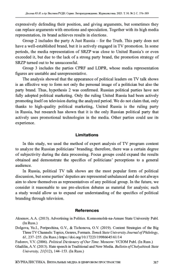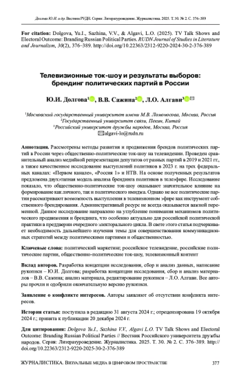 Reviewed to the impact of TV talk shows on the perception of political party brands in Russia. Research focuses on the methods of brand development and promotion of political party brands in Russia, particularly through socio-political talk shows on television. We conducted a longitudinal comparative analysis of the media representation of deputies from various parties in 2019 and 2021, along with a qualitative study of politicians’ performances in 2023 across three federal channels: Channel One, Russia 1, and NTV. Based on our findings, we propose a two-stage model for analyzing the branding of politicians in television broadcasts. The study found that socio-political talk shows have a significant impact on both personal and political image formation. However, not all political parties take advantage of this opportunity to promote their image through broadcasts. The availability of administrative resources is not always a determining factor in a party’s success in branding. This work aims to enhance the understanding of the mechanisms involved in political promotion and branding, which is especially pertinent to Russian political practice as we approach the next electoral cycle. In light of this, the article underscores the necessity for further research to refine communication strategies between political parties and the public.