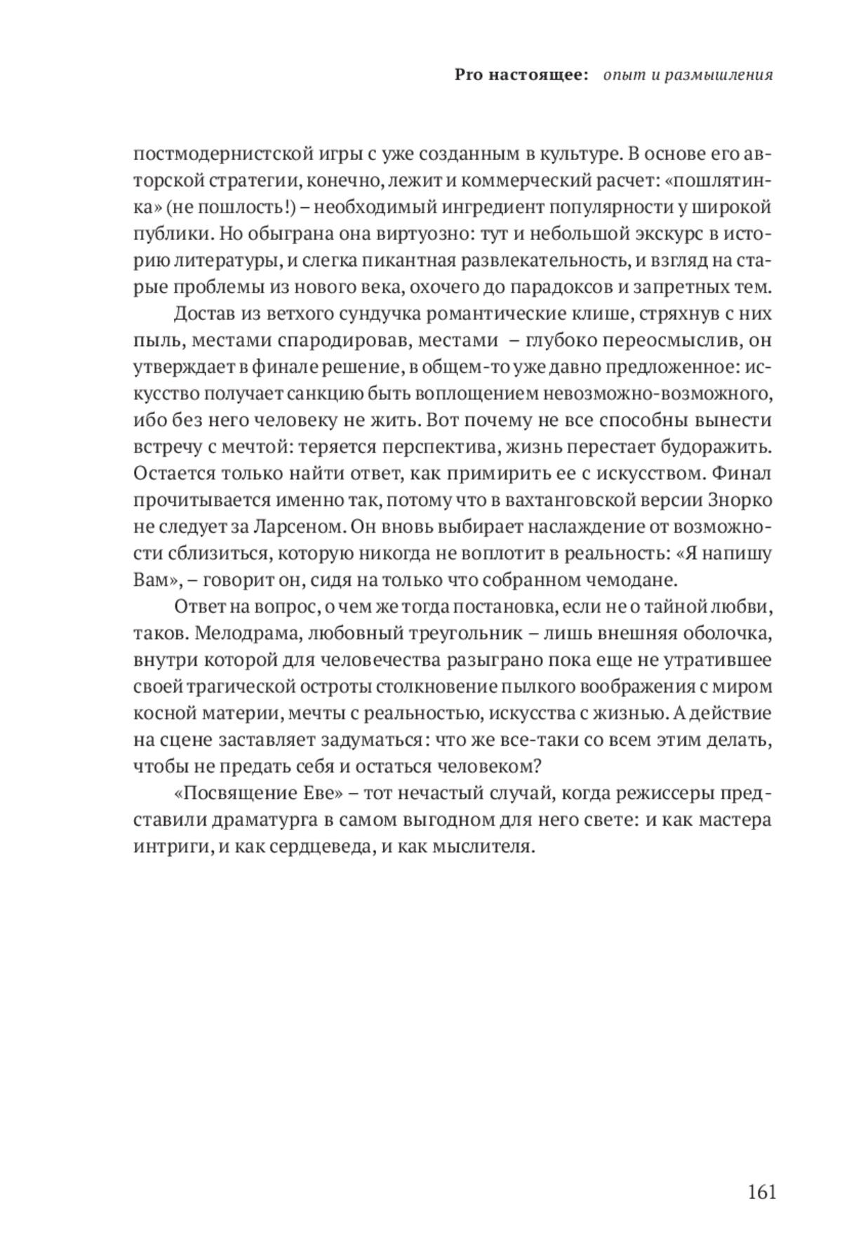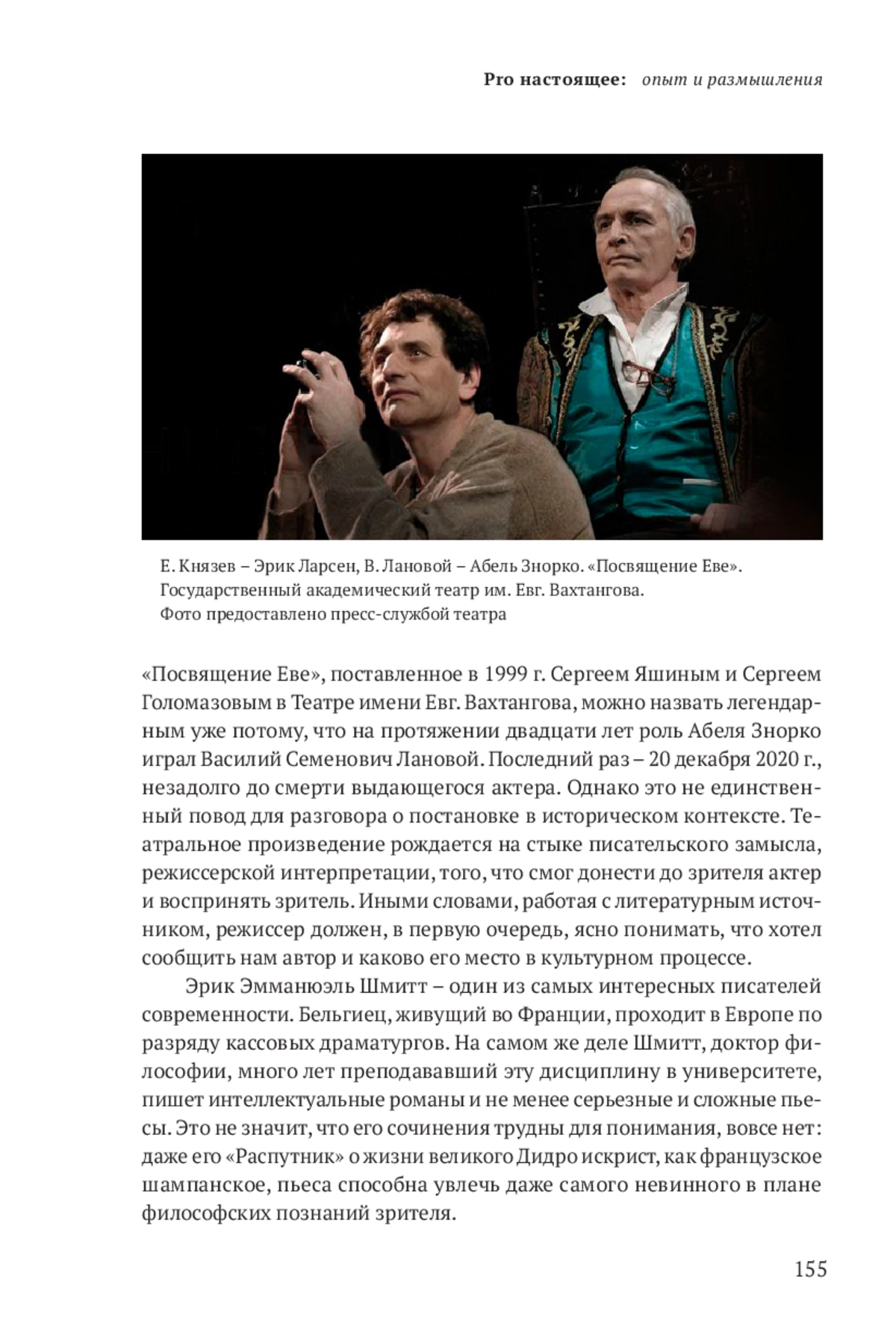 «Посвящение Еве», поставленное в 1999 г. Сергеем Яшиным и Сергеем Голомазовым в Театре имени Евг. Вахтангова, можно назвать легендарным уже потому, что на протяжении двадцати лет роль Абеля Знорко играл Василий Семенович Лановой. Последний раз – 20 декабря 2020 г., незадолго до смерти выдающегося актера. Однако это не единственный повод для разговора о постановке в историческом контексте. Театральное произведение рождается на стыке писательского замысла, режиссерской интерпретации, того, что смог донести до зрителя актер и воспринять зритель. Иными словами, работая с литературным источником, режиссер должен, в первую очередь, ясно понимать, что хотел сообщить нам автор и каково его место в культурном процессе.