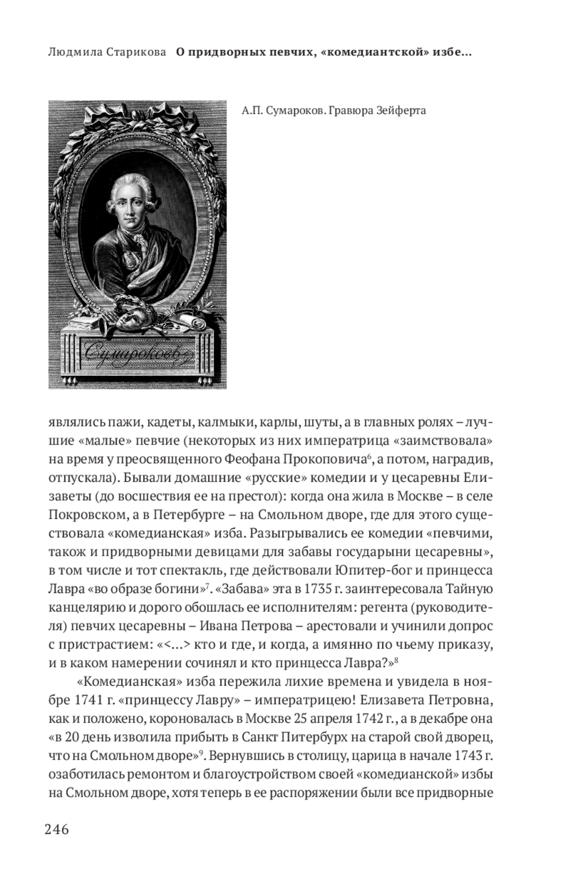 СТАРИКОВА Л. М. О ПРИДВОРНЫХ ПЕВЧИХ, «КОМЕДИАНТСКОЙ» ИЗБЕ НА СМОЛЬНОМ ДВОРЕ И «РУССКИХ» ОПЕРАХ А. П. СУМАРОКОВА // ВОПРОСЫ ТЕАТРА. 2024. № 3-4