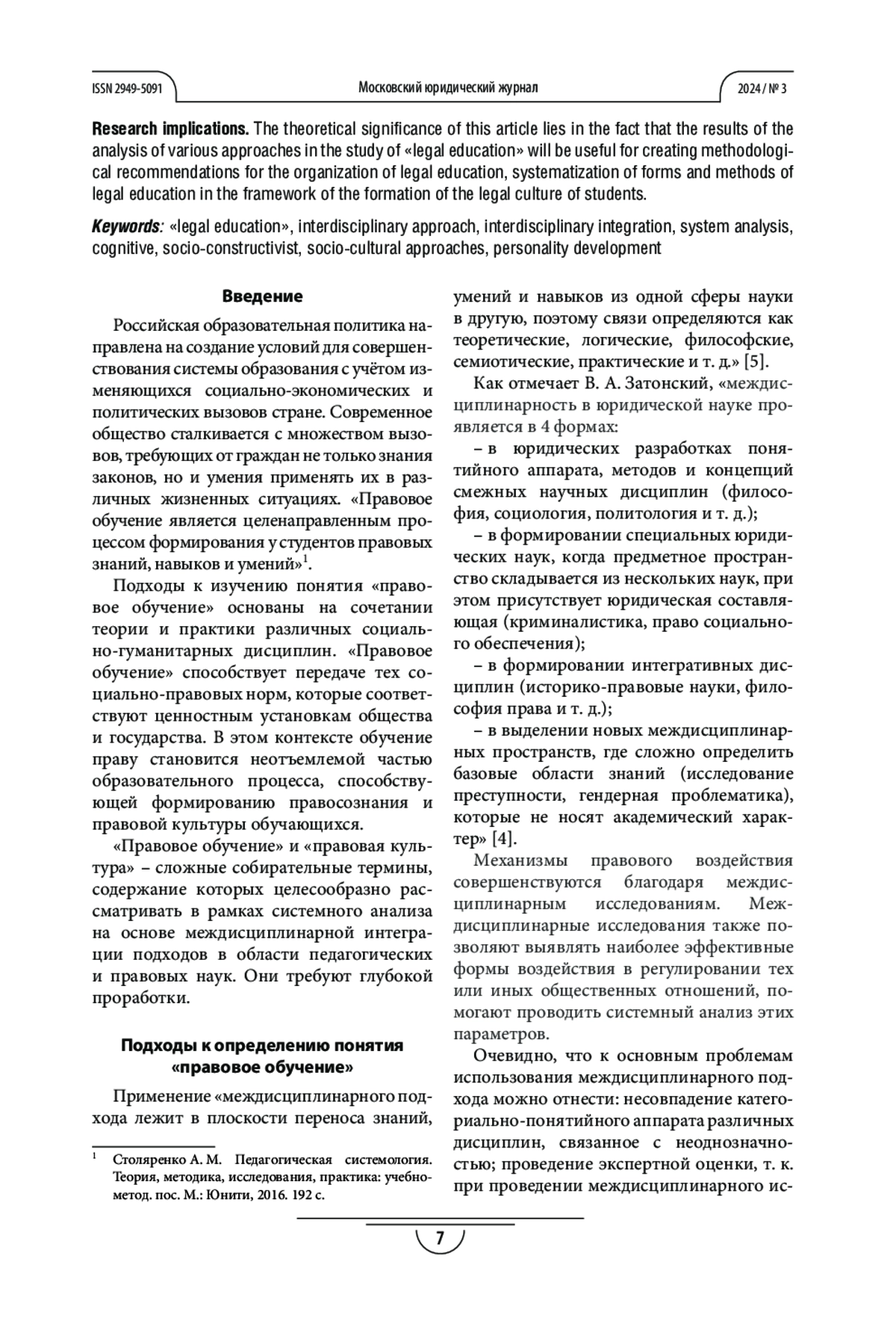 4. Затонский В. А. Междисциплинарный подход - методологическая основа определения эффективности права и правоприменения // Государственно-правовые исследования. 2020. № 3. С. 392-397.