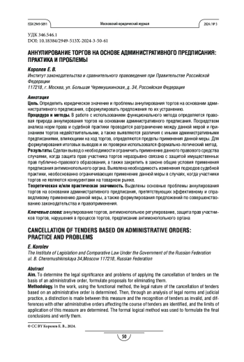 Процедура и методы. В работе с использованием функционального метода определяется правовая природа аннулирования торгов на основании административного предписания. Посредством анализа норм права и судебной практики проводится разграничение между данной мерой и признанием торгов недействительными, а также выявляются различия с иными административными предписаниями, влияющими на ход торгов, определяются пределы применения данной меры. Для формулирования итоговых выводов и их проверки использовался формально-логический метод.