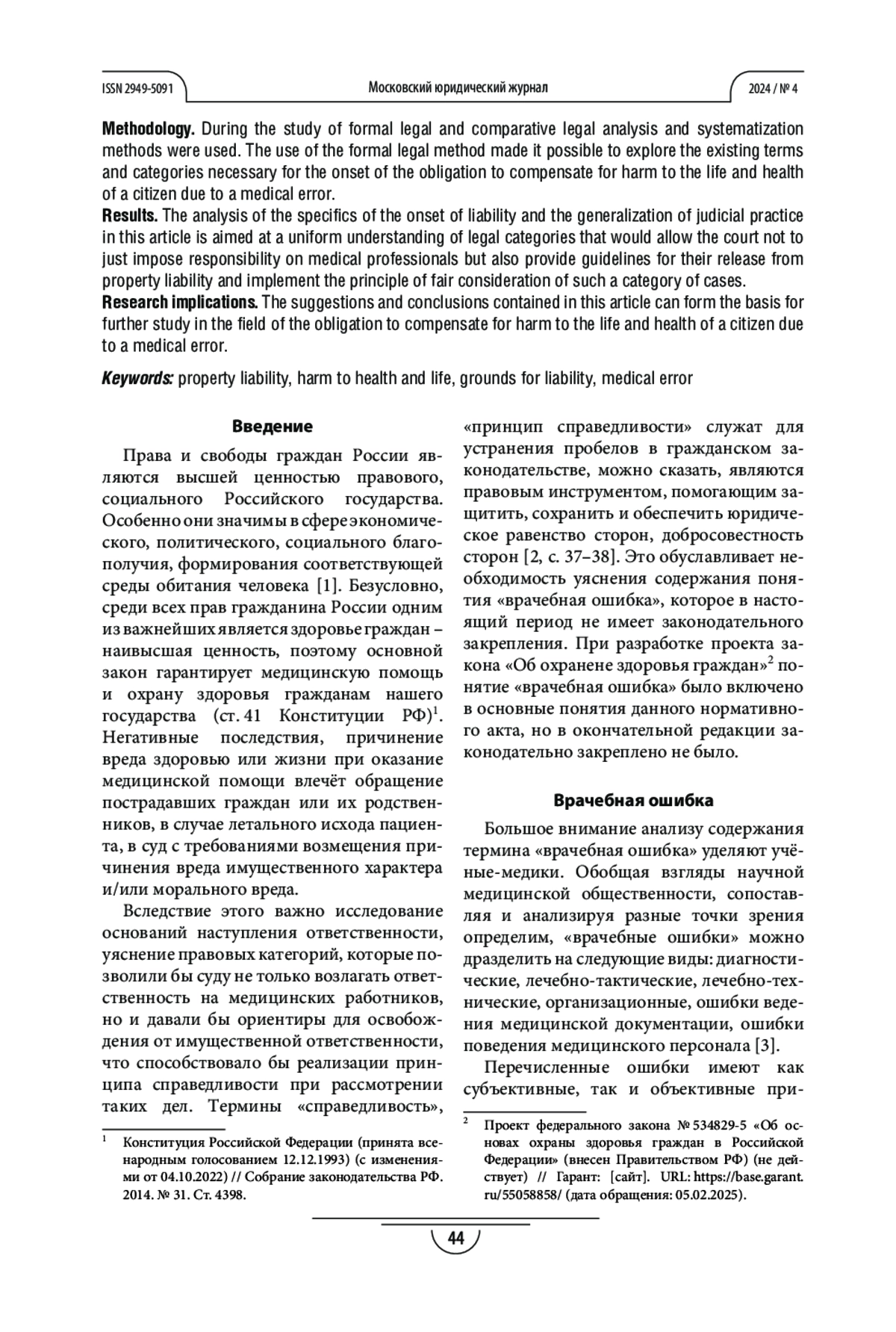 Процедура и методы. В работе использовались формально-юридический и сравнительно-правовоё методы анализа и систематизации. Применение формально-юридического метода позволило исследовать существующие термины и категории, необходимые для наступления обязанности по возмещению вреда жизни и здоровья гражданина вследствие врачебной ошибки. При помощи методов сравнительно-правового анализа и систематизации выявлены проблемы применения норм гражданского законодательства в данной сфере.